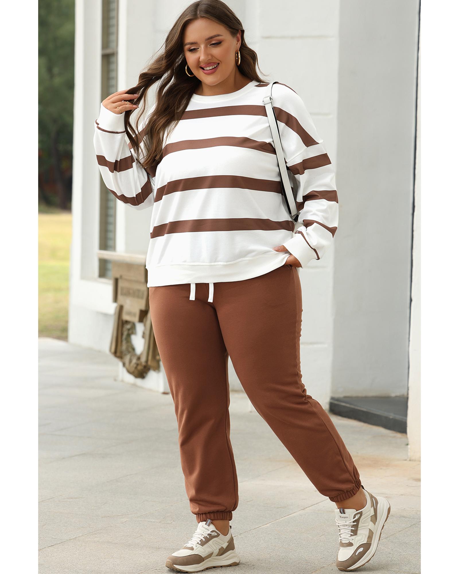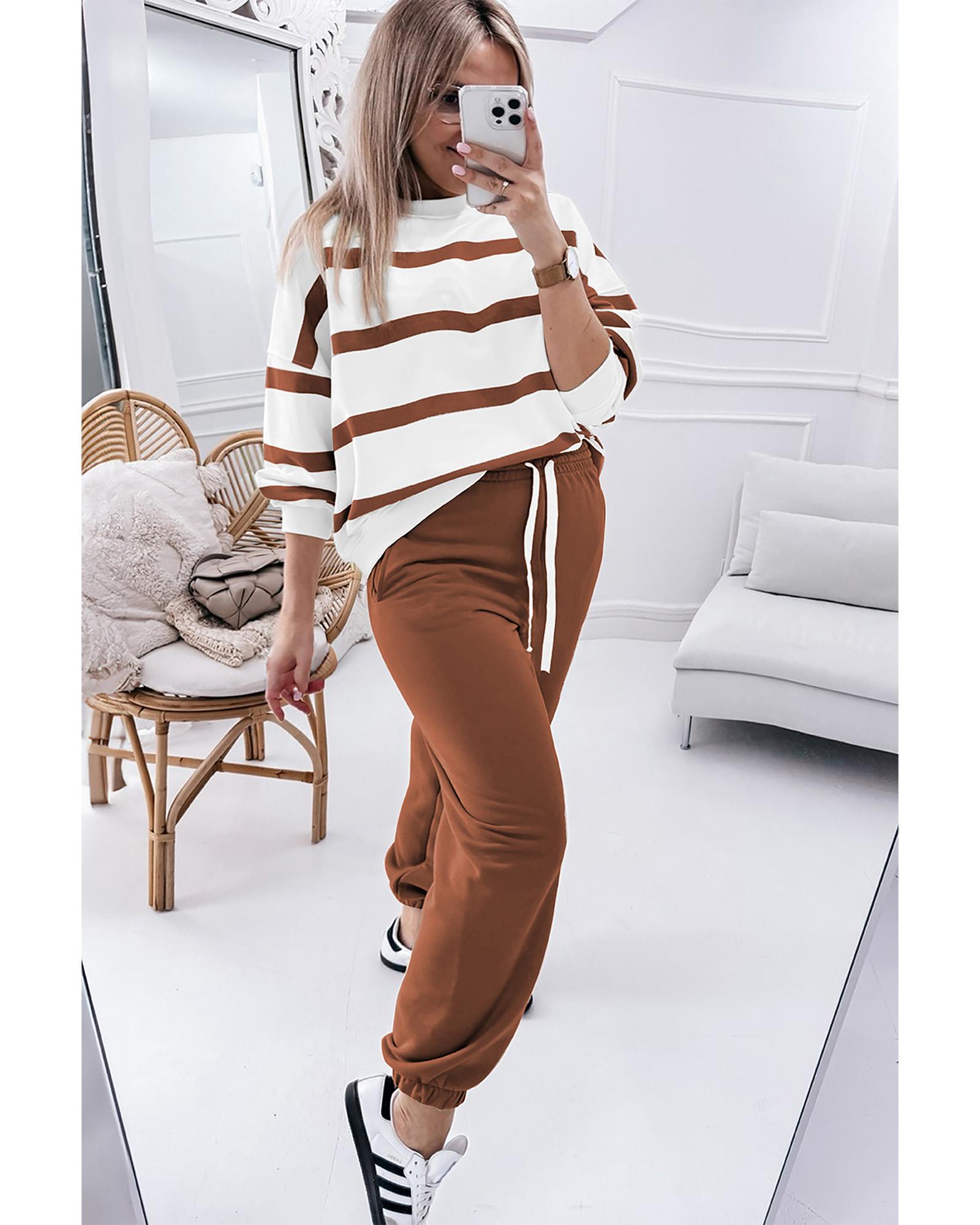 Brown Stripe Striped Drop Shoulder Pullover and Jogger Pants Set – L