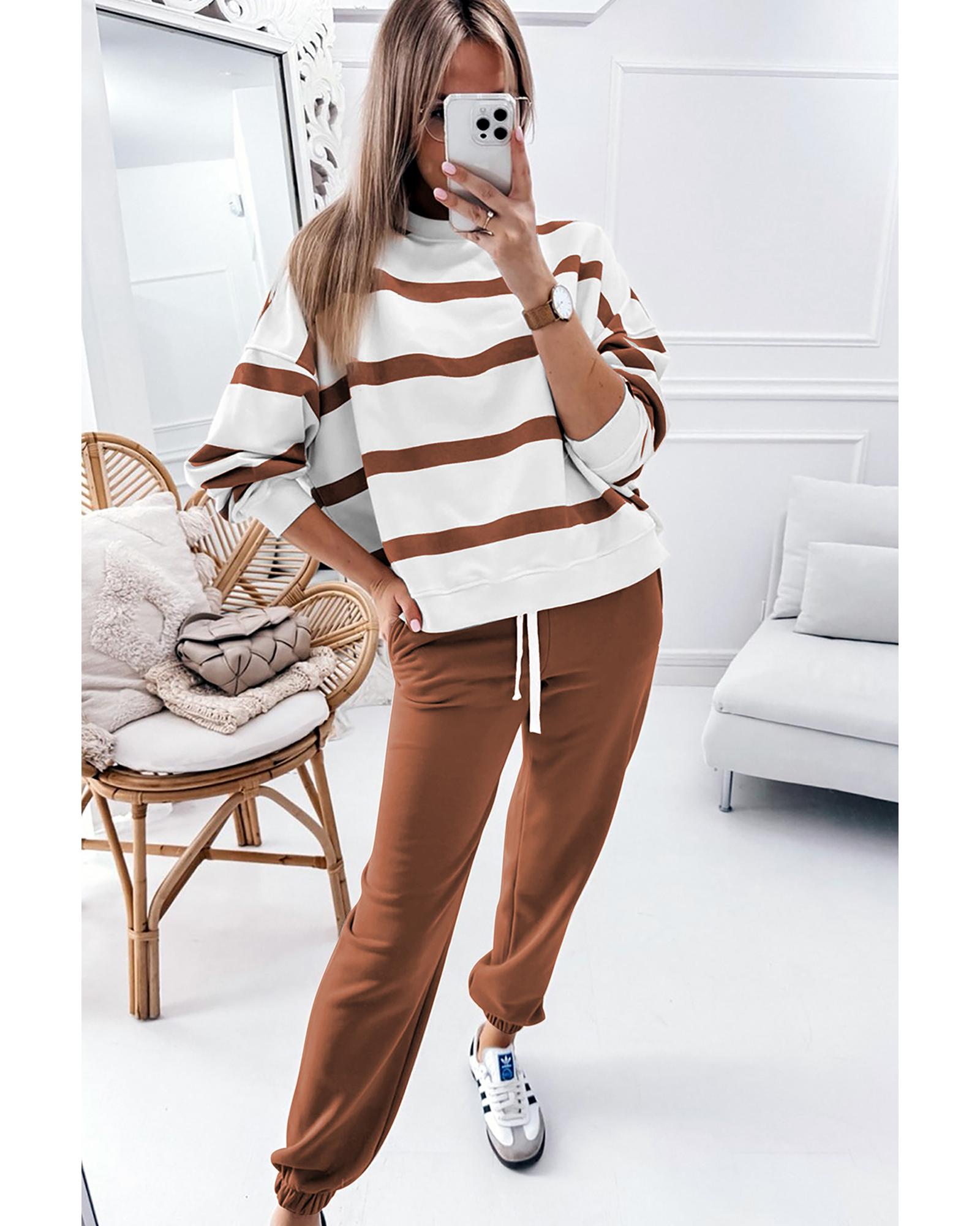 Brown Stripe Striped Drop Shoulder Pullover and Jogger Pants Set – S