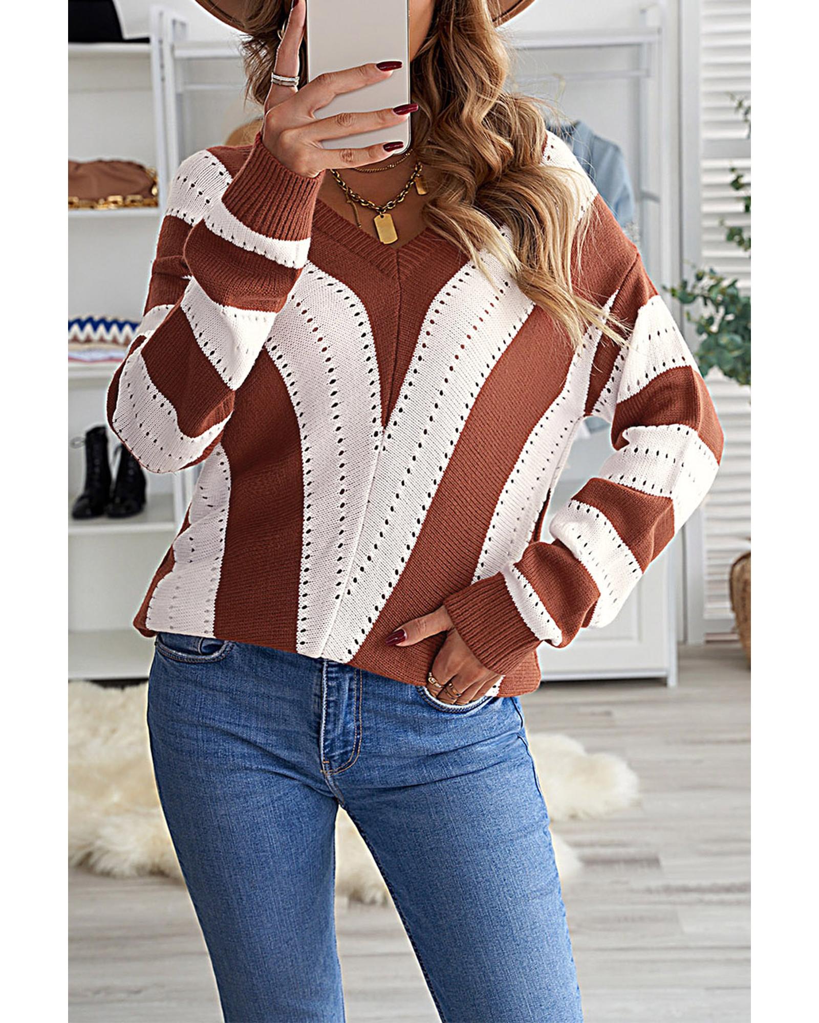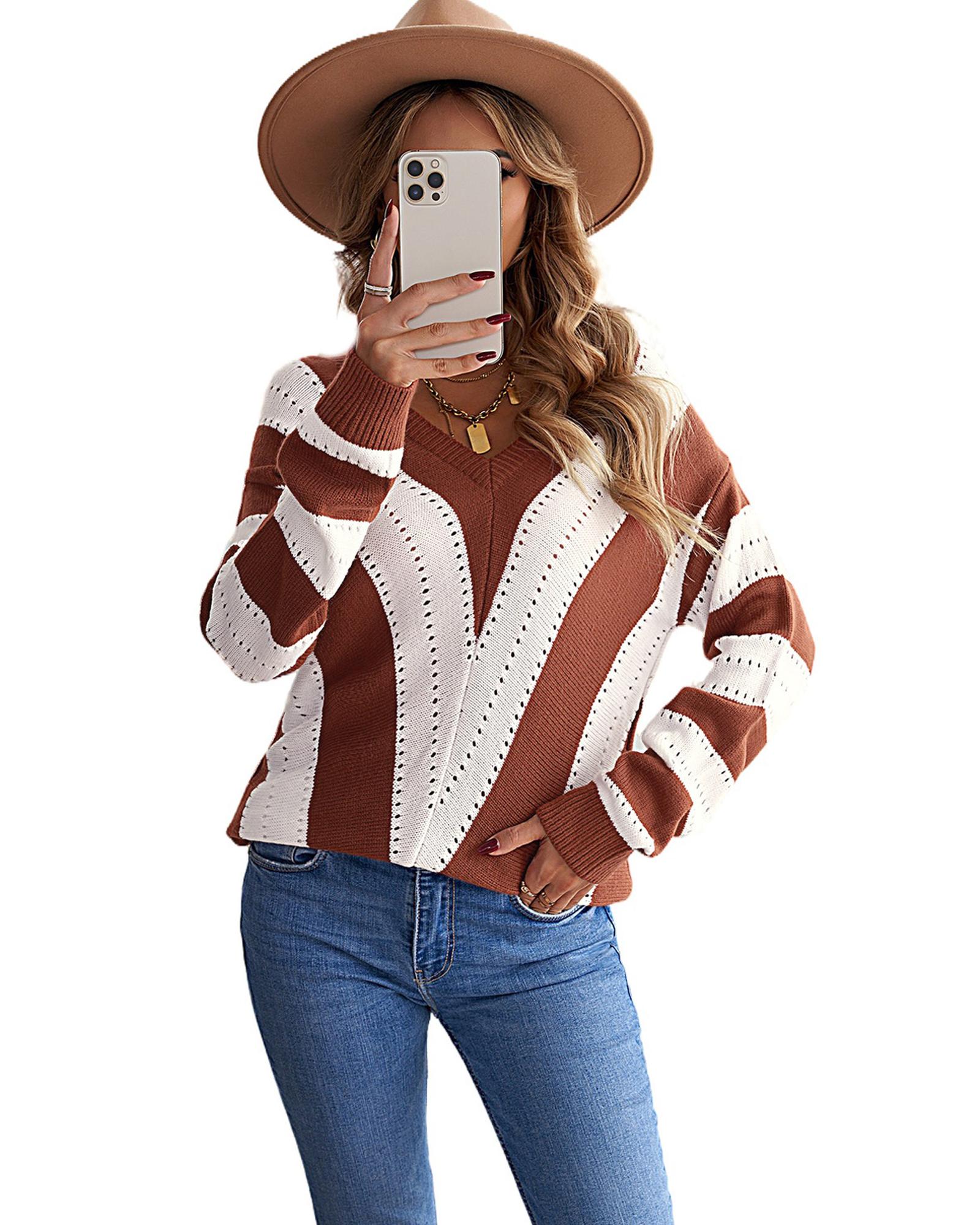 - Brown Striped Colorblock V Neck Knitted Sweater