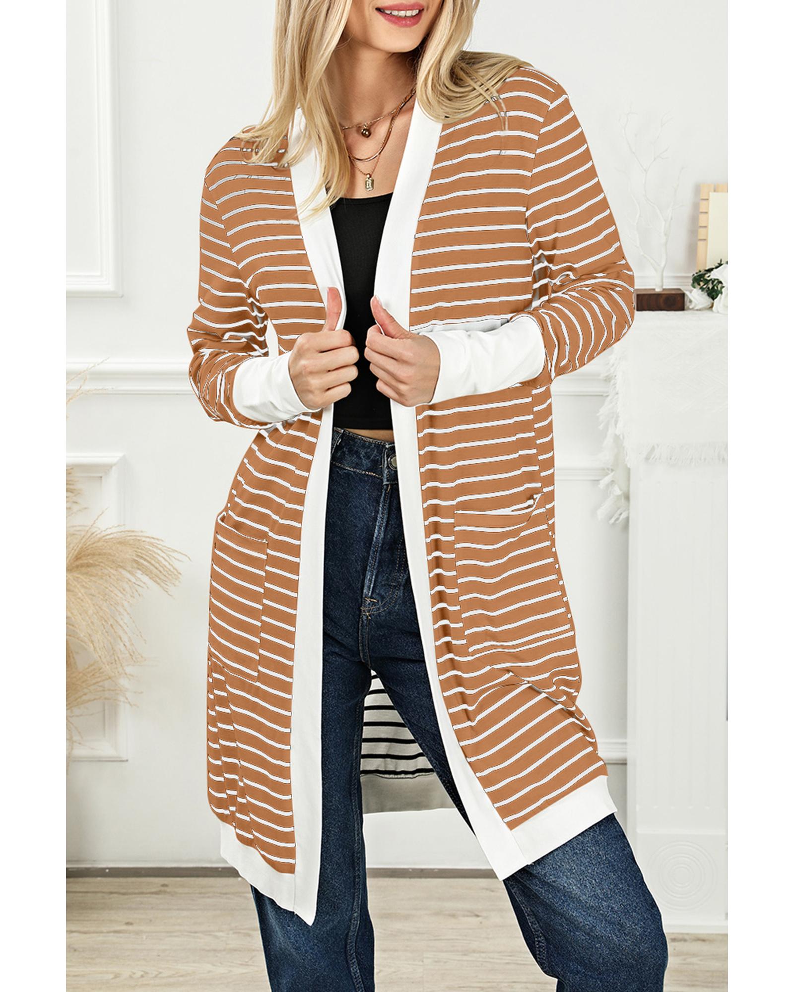 - Elevate your wardrobe with this versatile Brown Striped Side Pockets Open Front Cardigann