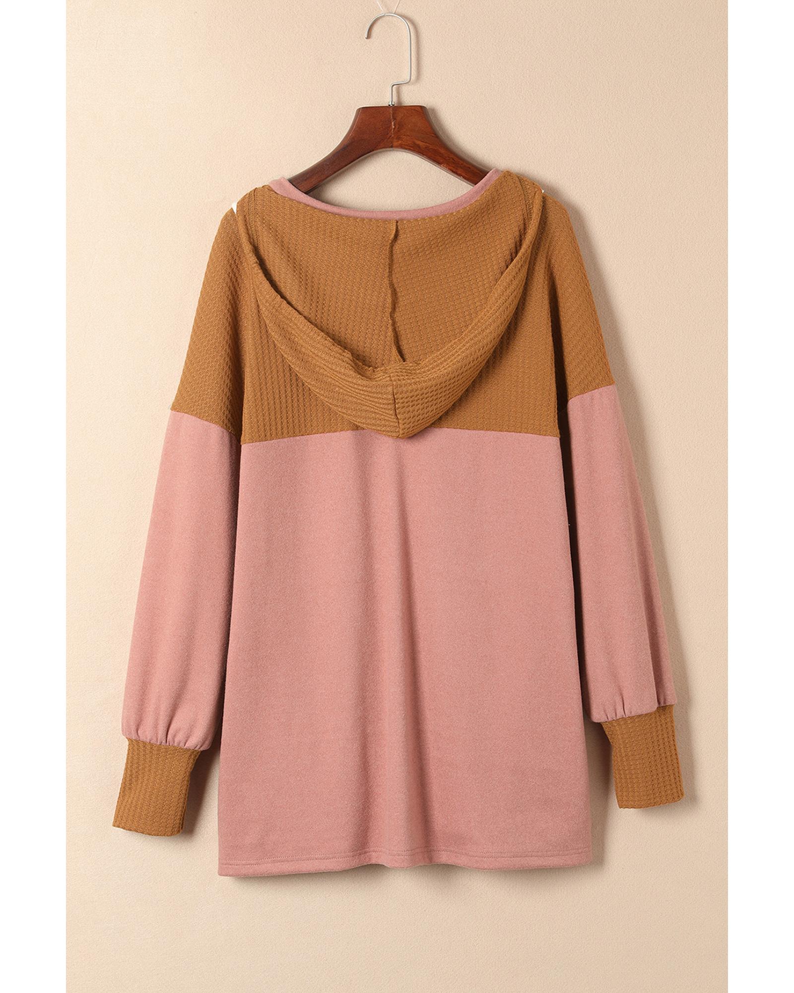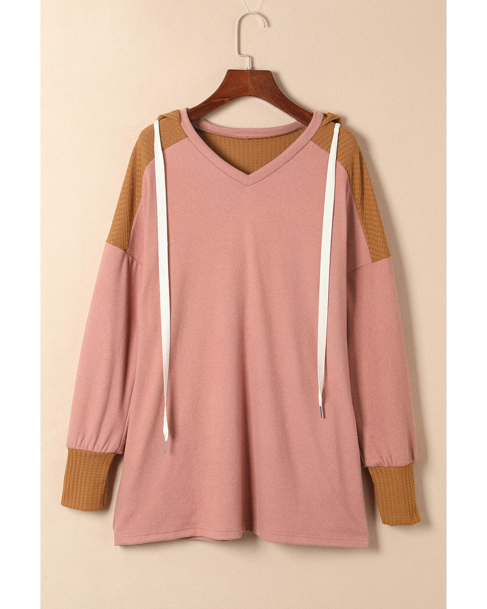Brown Waffle Knit Patchwork Drawstring V Neck Hoodie – M