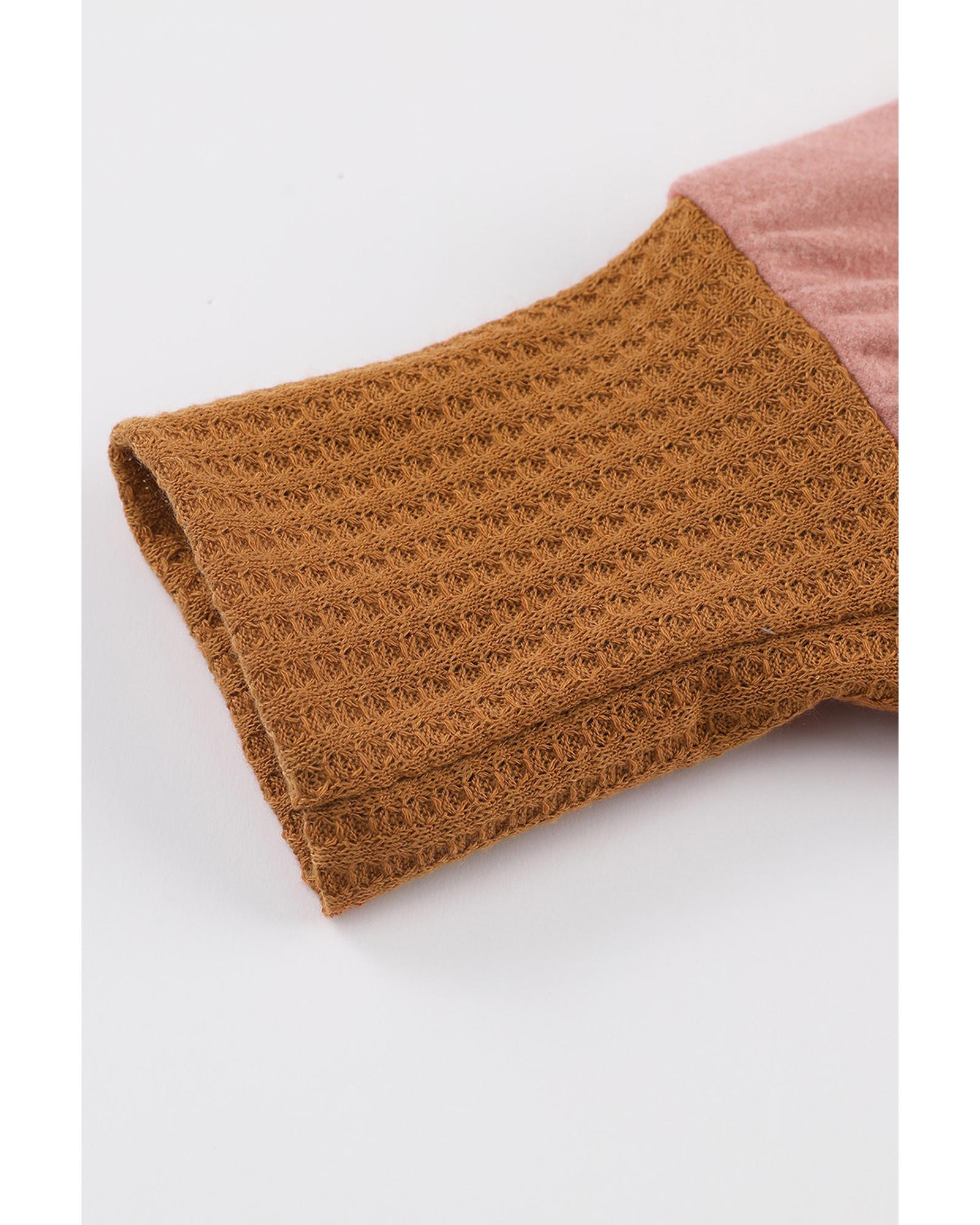 Brown Waffle Knit Patchwork Drawstring V Neck Hoodie – S