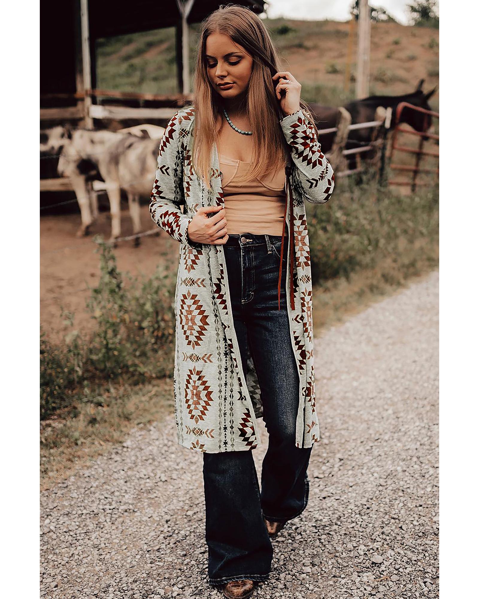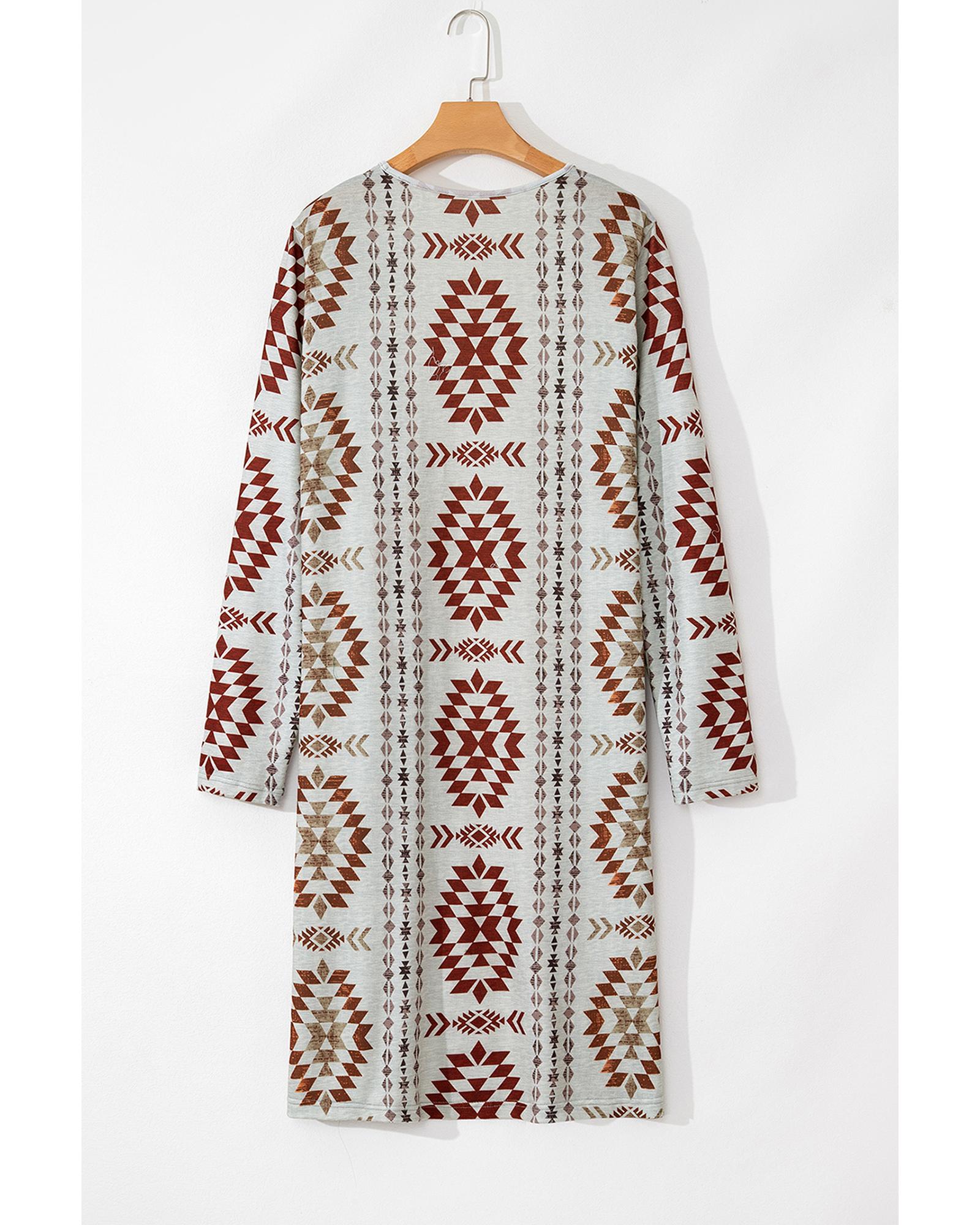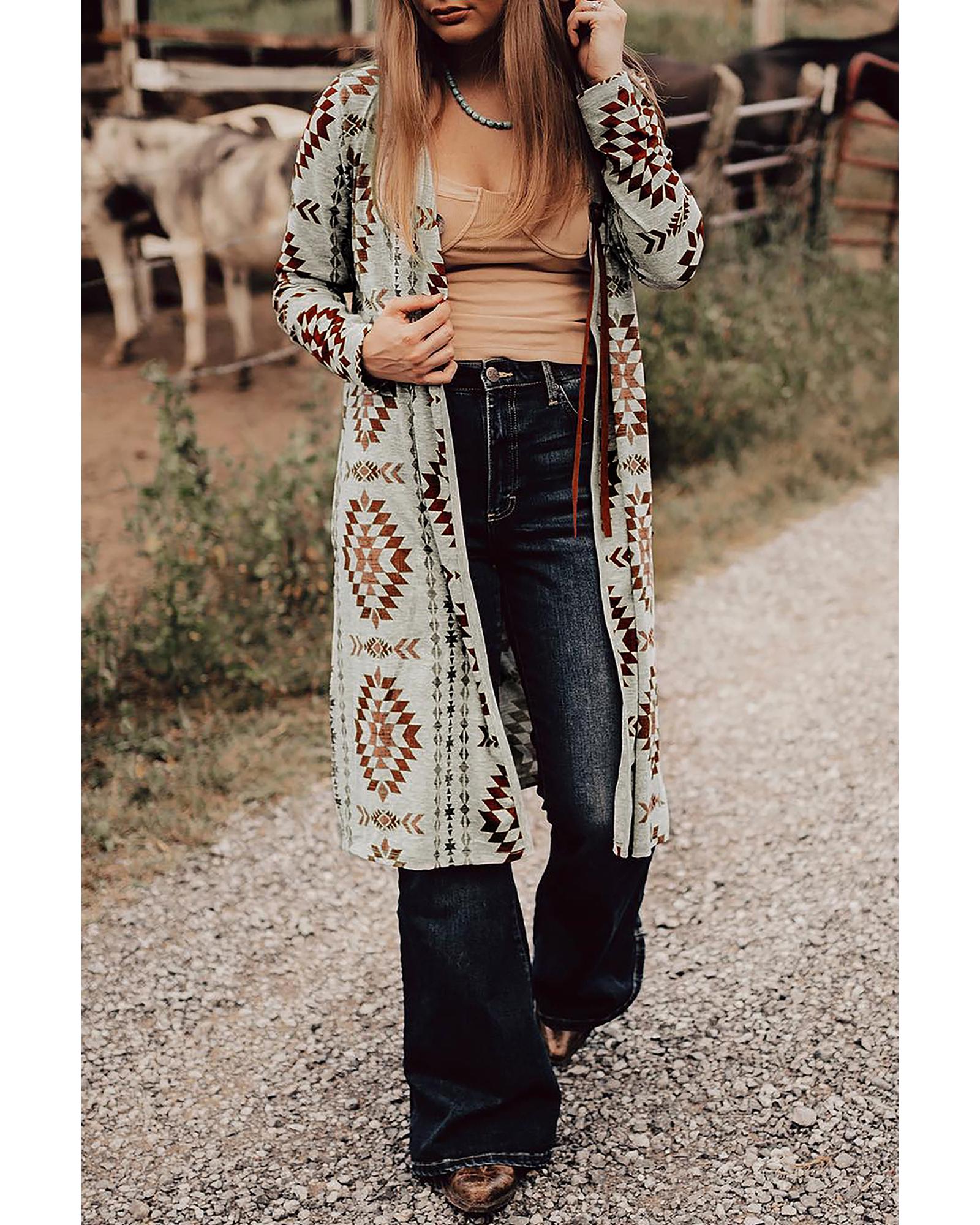 Brown Western Aztec Printed Open Front Long Cardigan – S