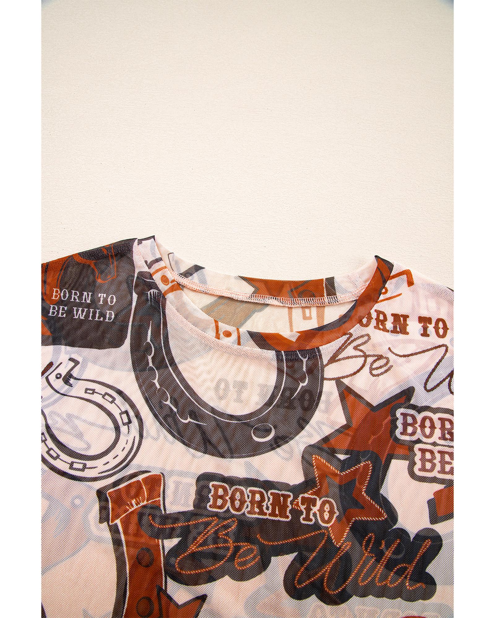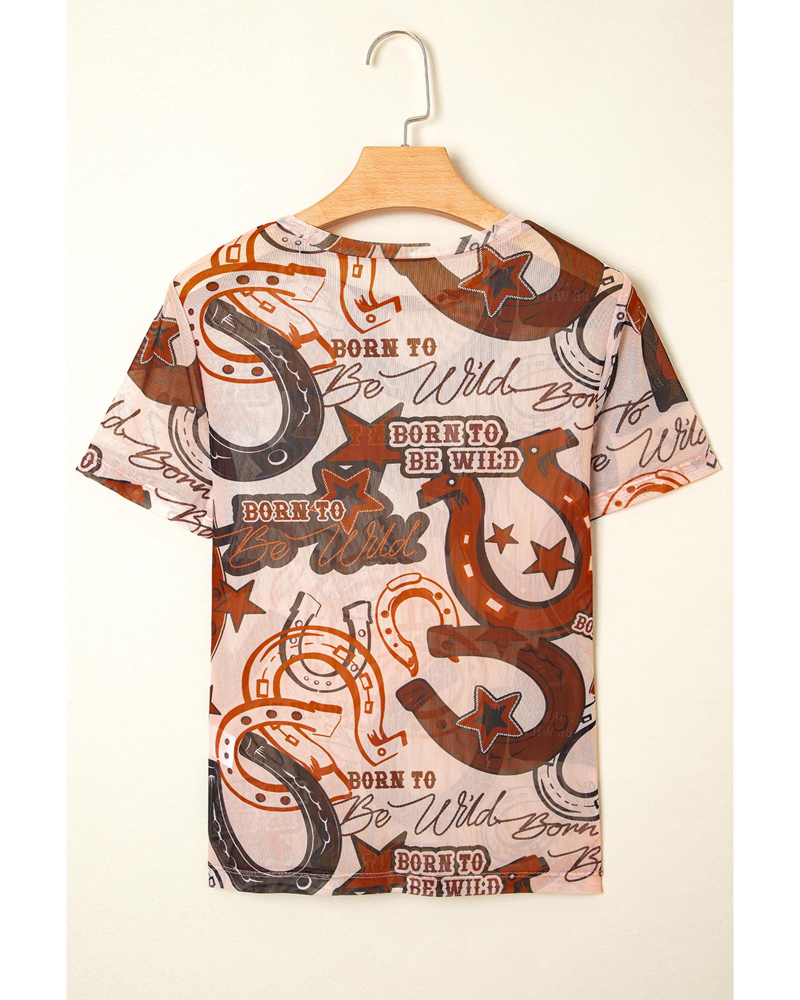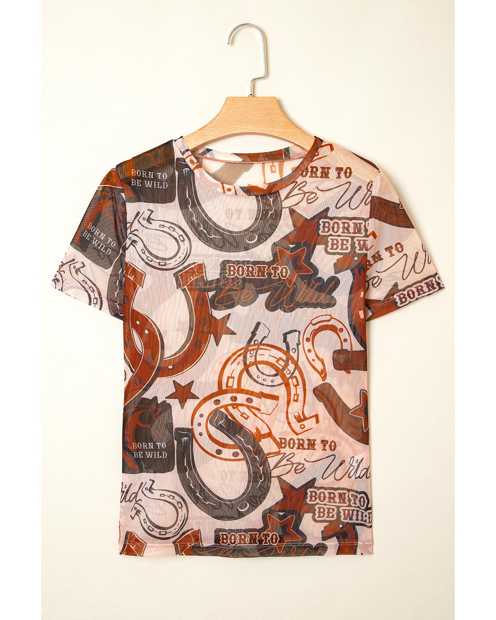 Brown Western Horseshoe Printed Mesh T Shirt – M