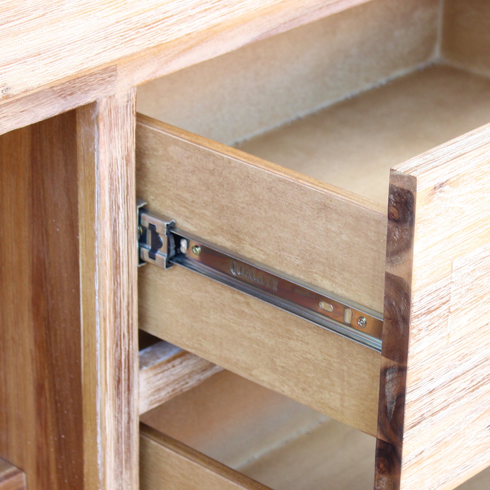 The Buffet is elevated with strong and sturdy wooden legs which mount it firmly with the ground. These also keep it a little high from the ground which enables you to clean away the dirt and dust underneath.