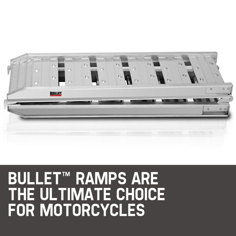 Finished in the absolute highest quality marine grade alloy, BULLET loading ramps are expertly machine welded and assembled using correct load rated fasteners, plus feature an ultra-convenient fold away design that tucks into any corner of your vehicle, BULLET Ramps are the ultimate choice for self sufficient riders!