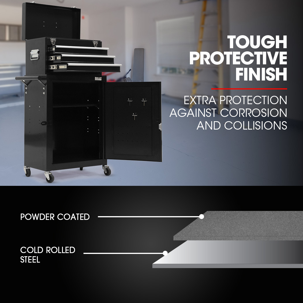 Both the cabinet and chest are built with high tensile powder coated steel enclosures. Equipped with an EVA mat, each drawer slides effortlessly in and out on smooth ball bearing rails, which makes finding and accessing each tool a cinch. The cabinet also comes with 3 pegs and the chest is easily transportable thanks to its side carry handles.