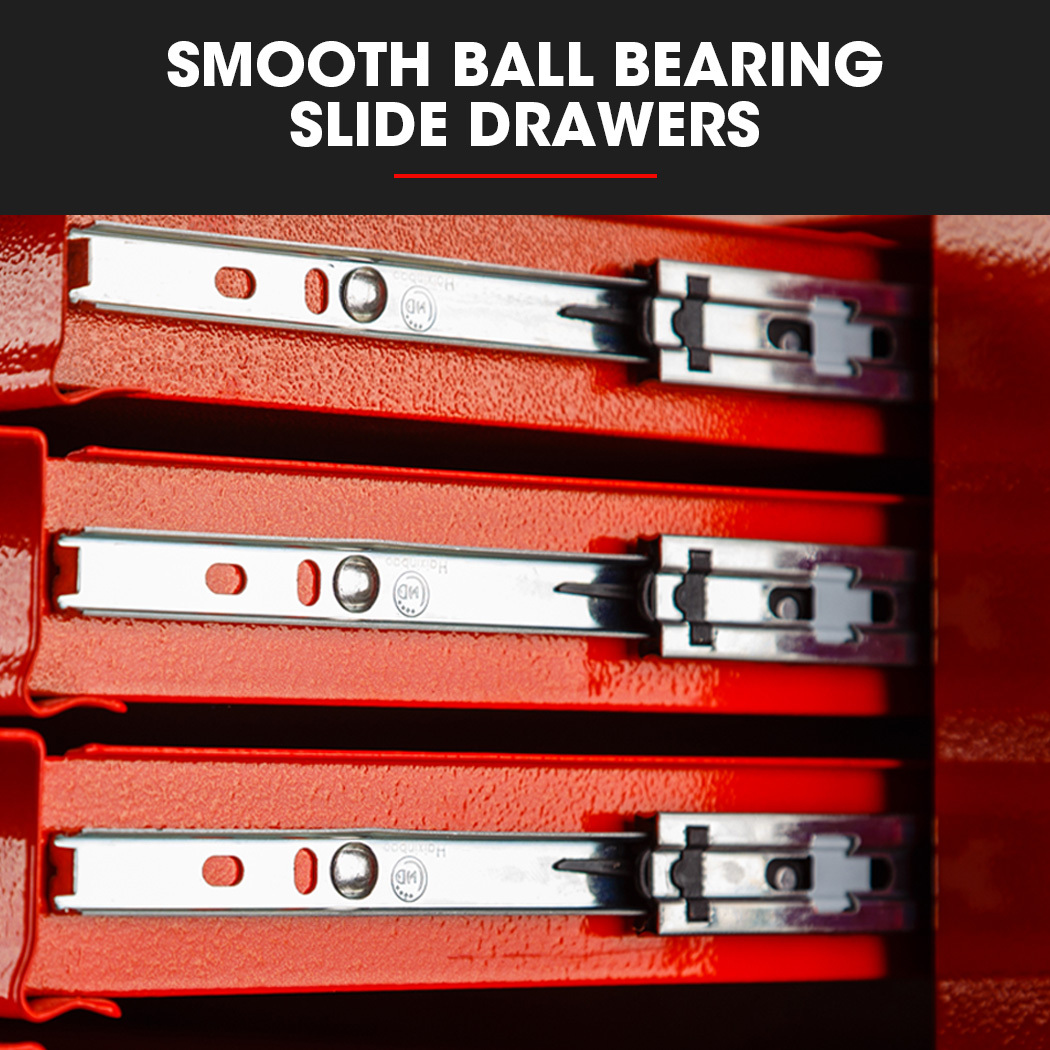 The chest is built with a high tensile powder coated steel enclosure. Each drawer slides effortlessly in and out on smooth ball bearing rails, which makes finding and accessing each tool a cinch, and each drawer contains an EVA mat to protect the tools. The unit is easily transportable, thanks to its side carry handles.