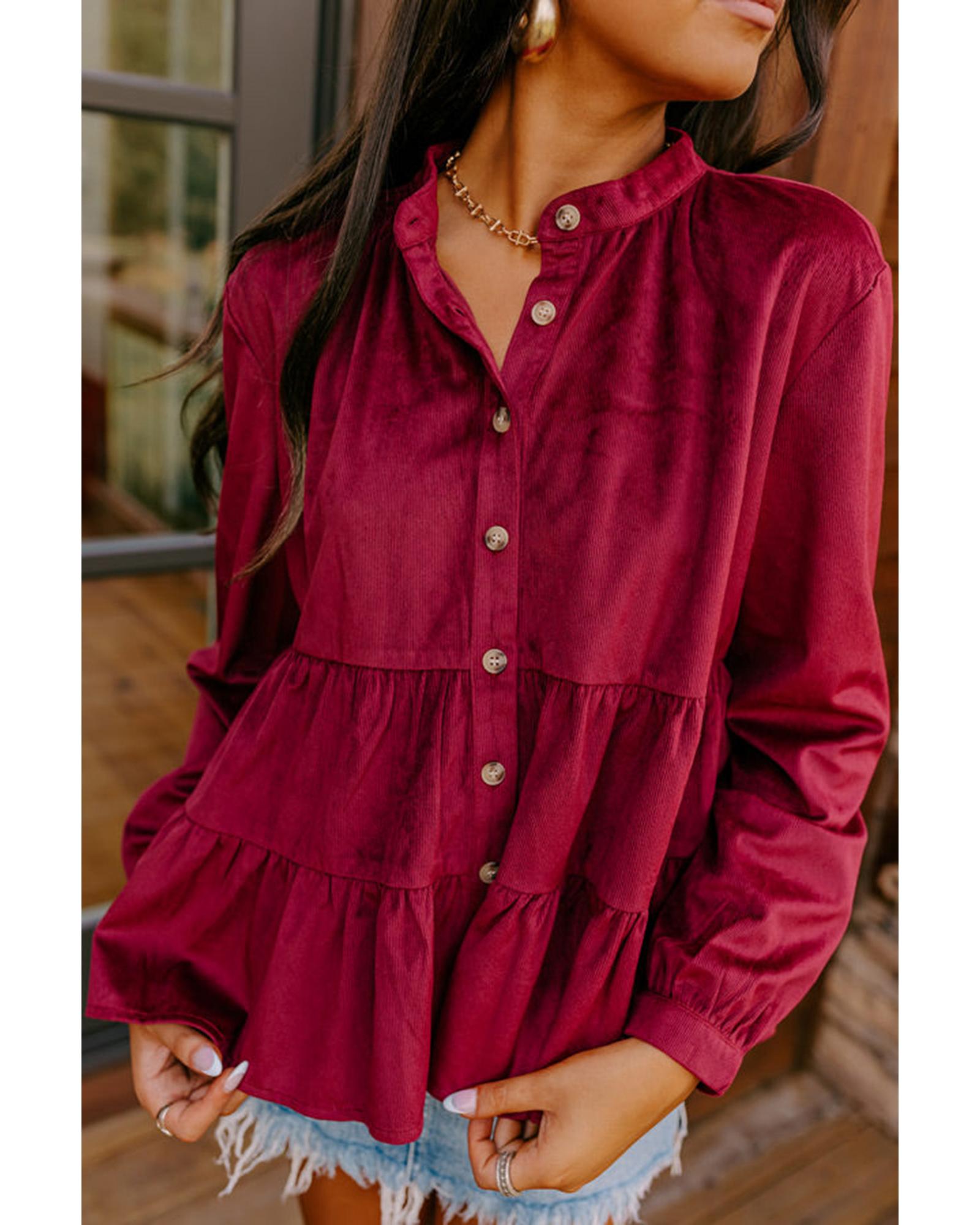 Burgundy Corduroy Ruffle Tiered Buttoned O Neck Shirt – XL