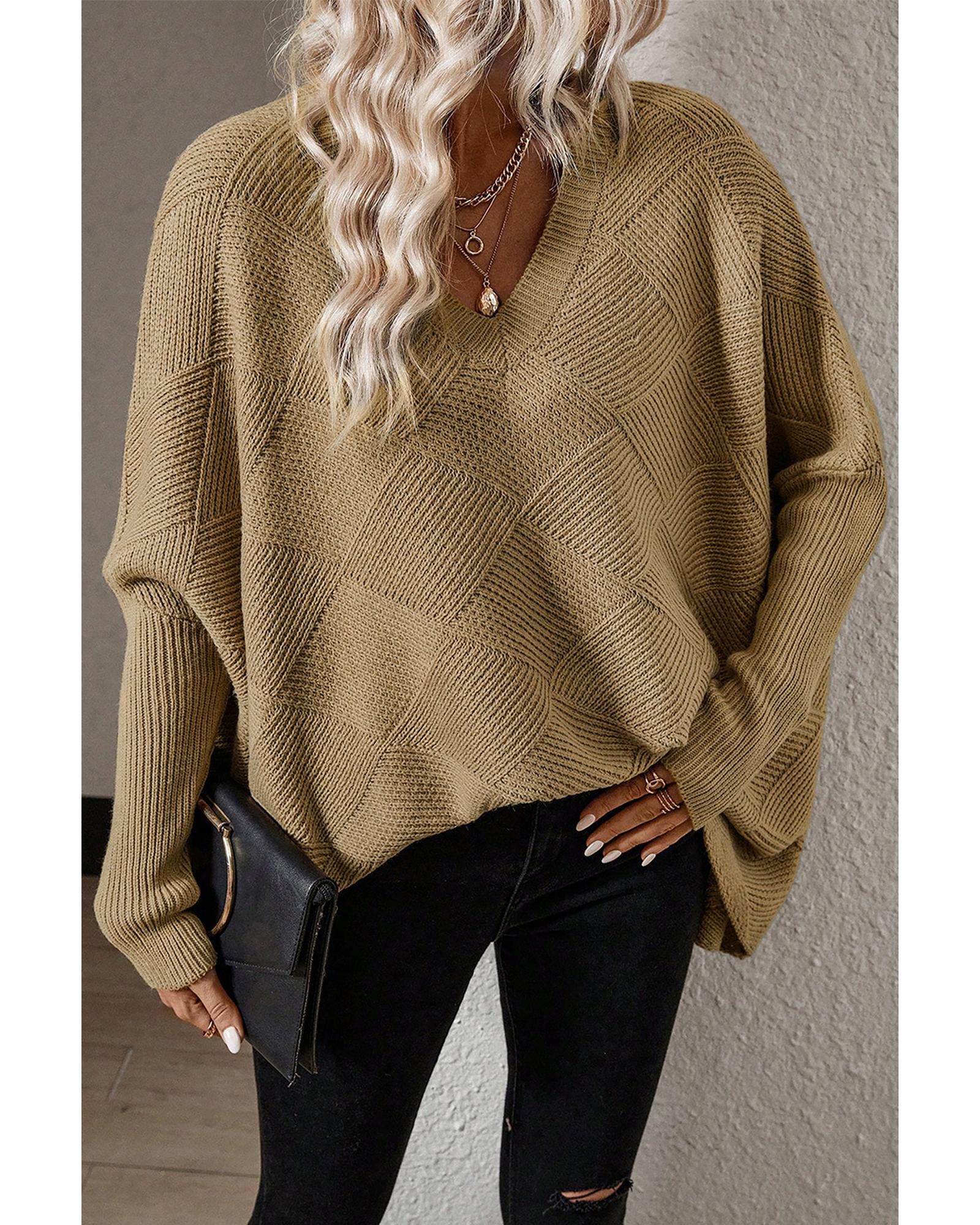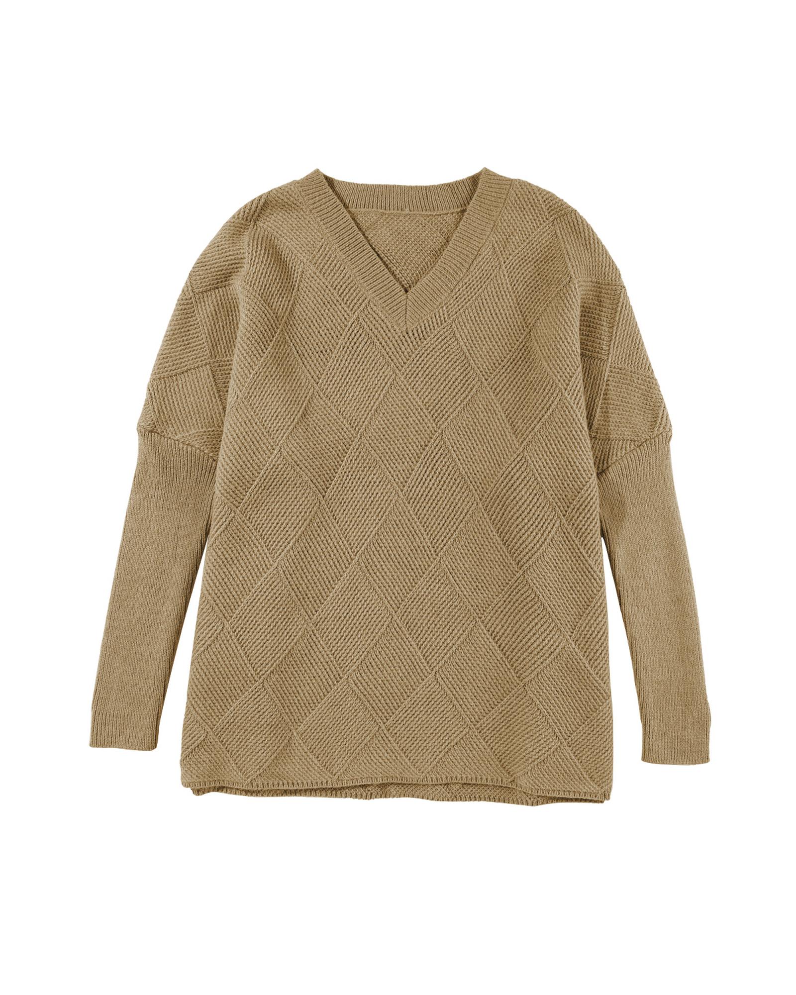 Camel Checkered Textured Batwing Sleeve Sweater – L