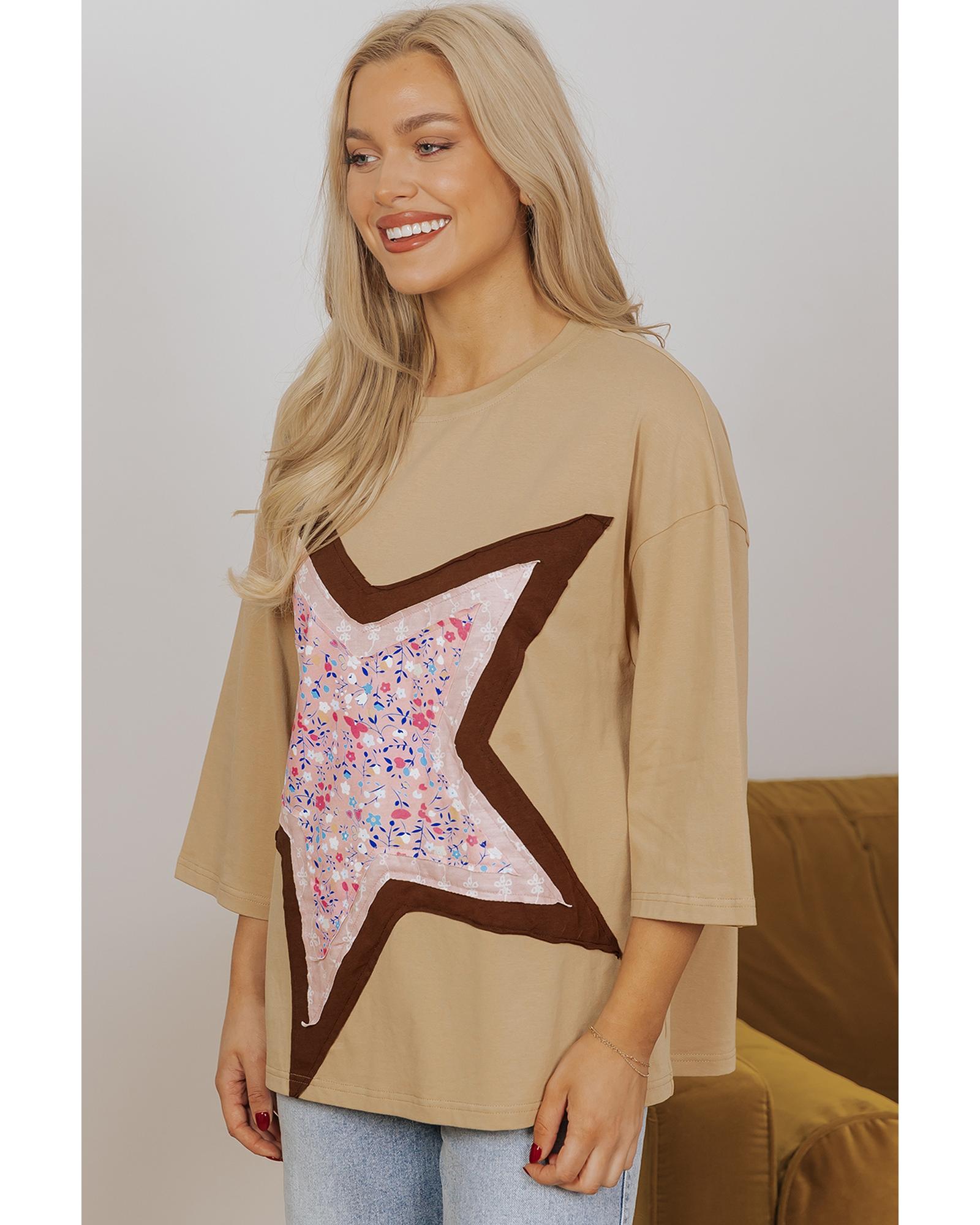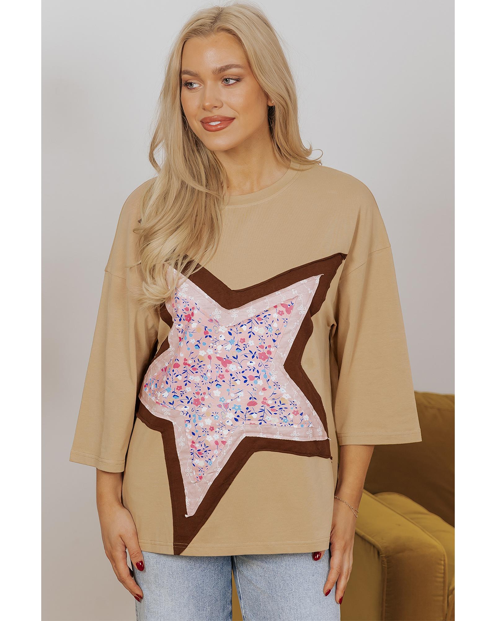 Camel Floral Star Patchwork 3/4 Long Sleeve Top – M