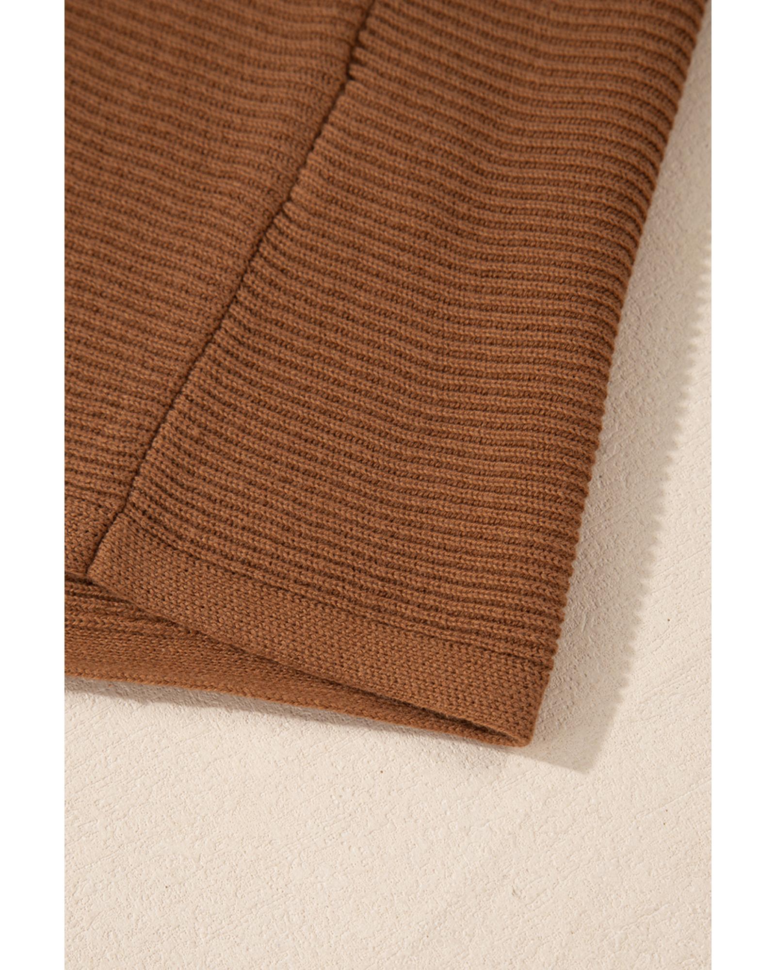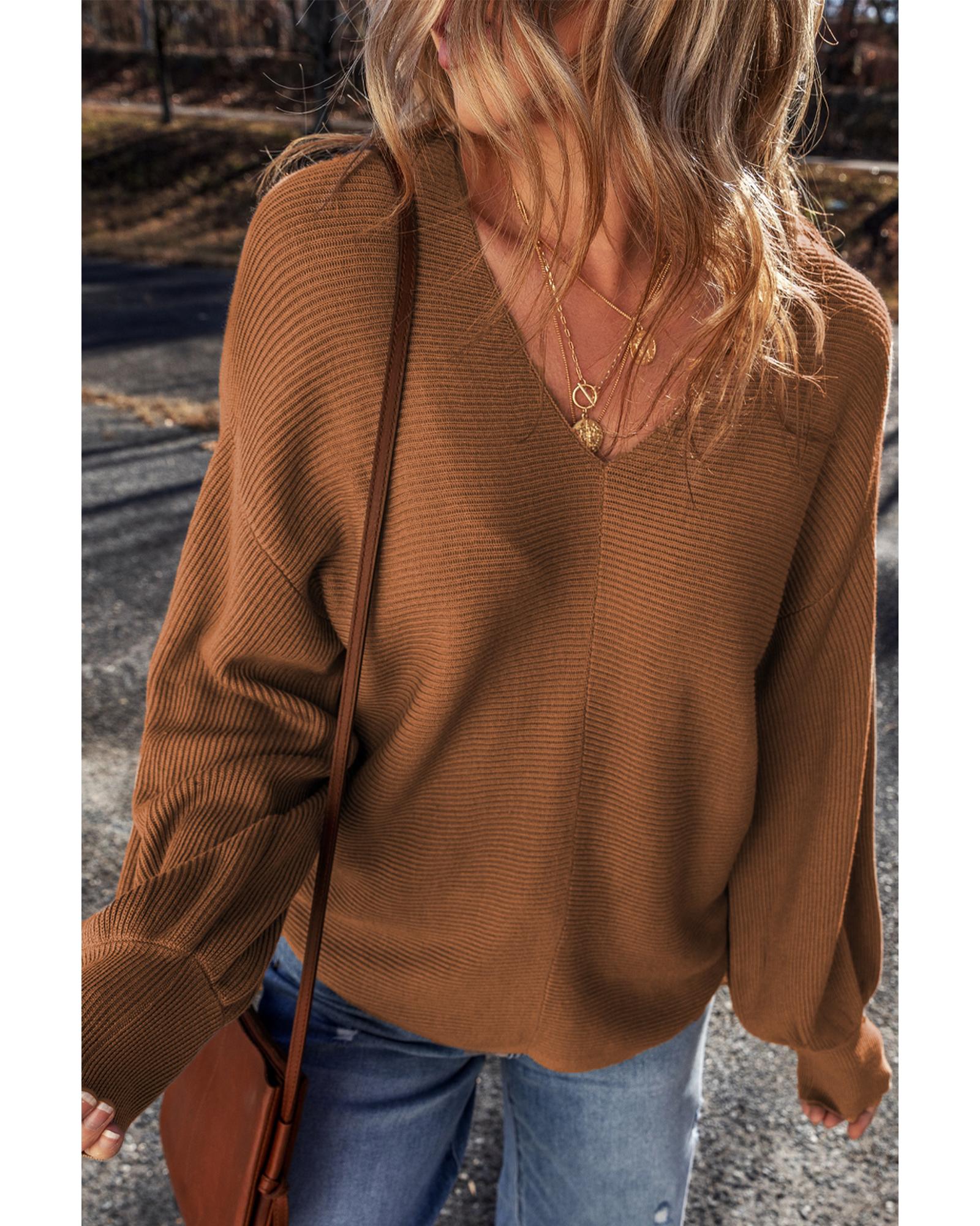 Camel Ribbed Knit Drop Sleeve V Neck Loose Fit Sweater – M