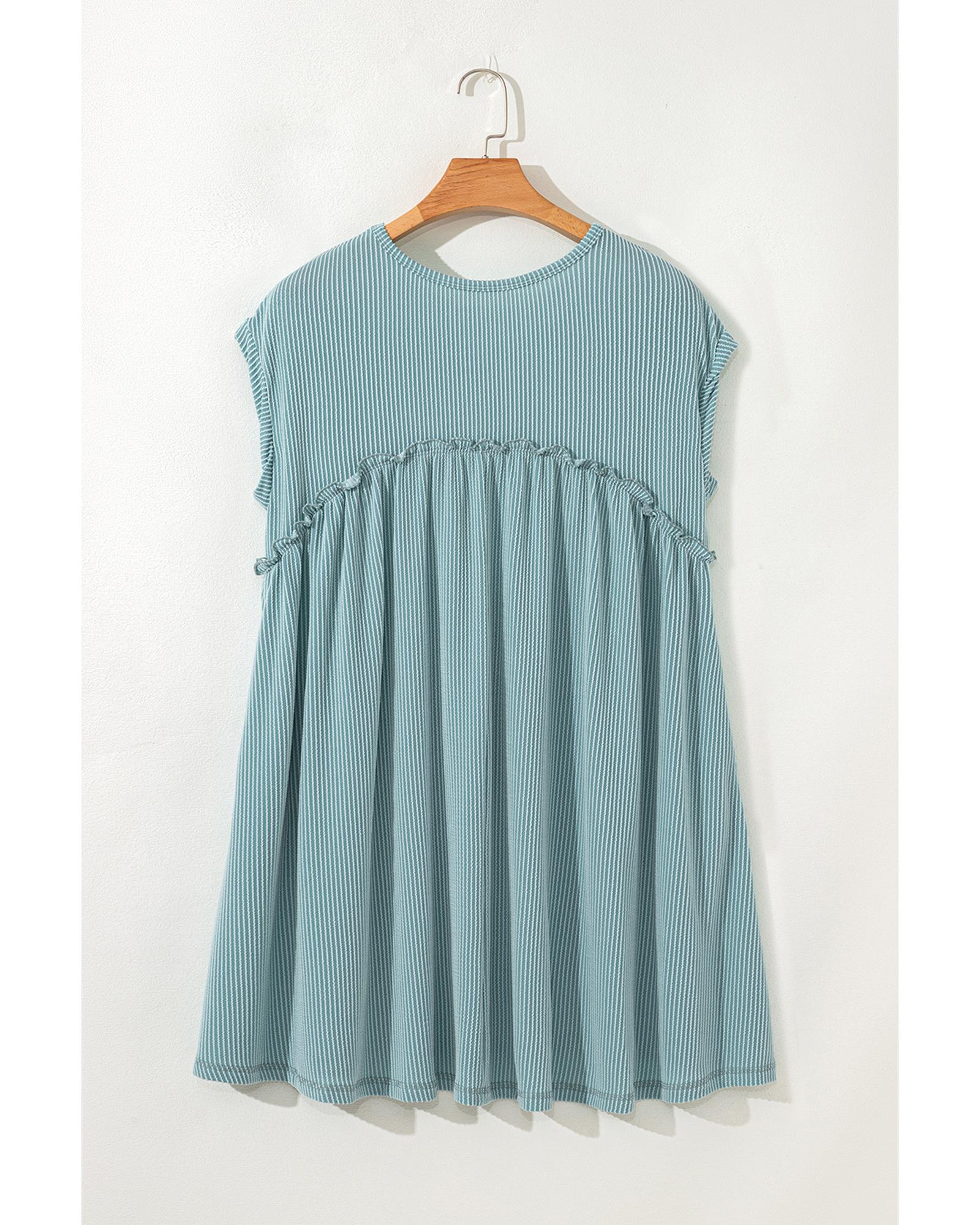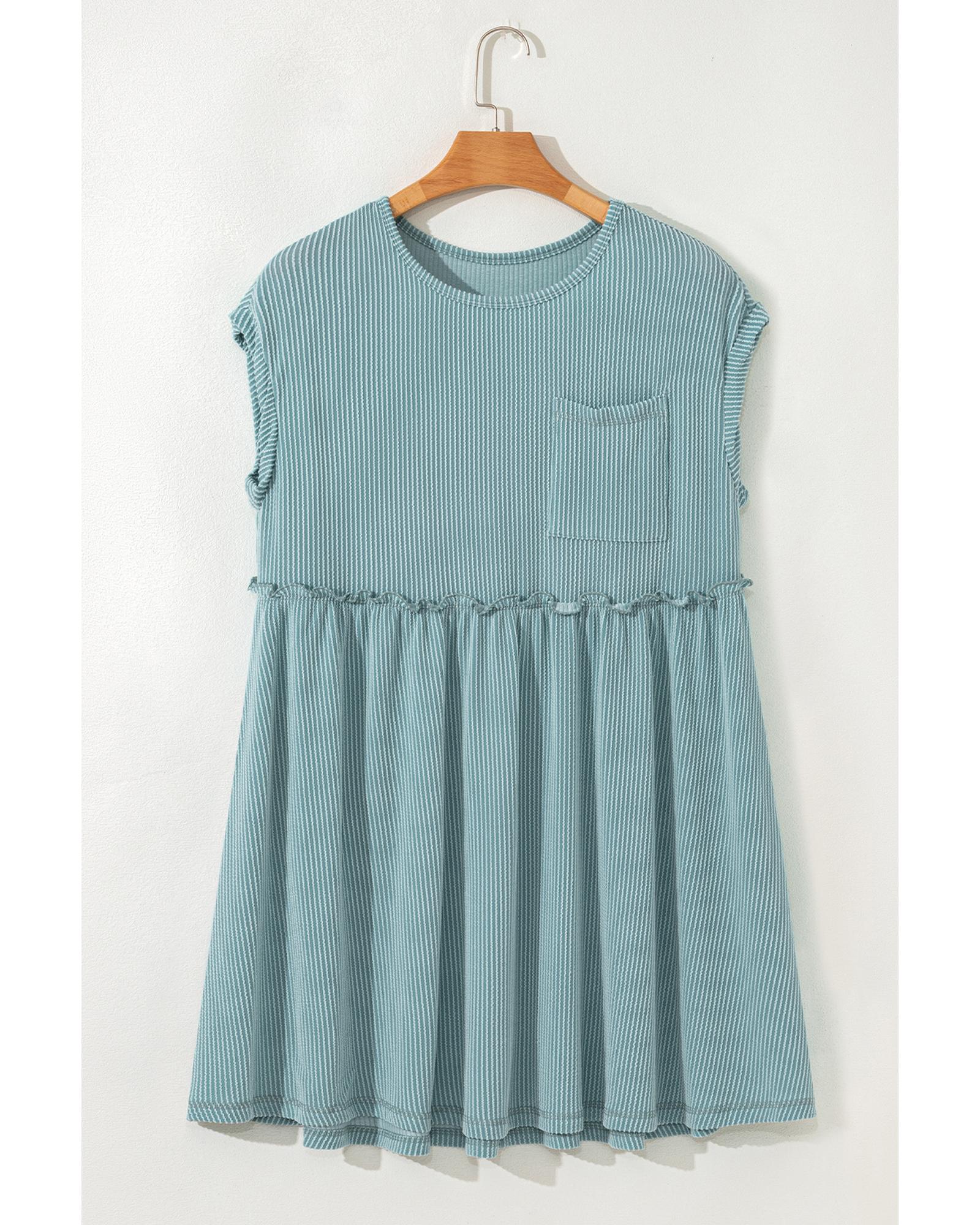 Canton Corded Knit Textured Patched Pocket Frilled Swing Mini Dress with Pockets – L
