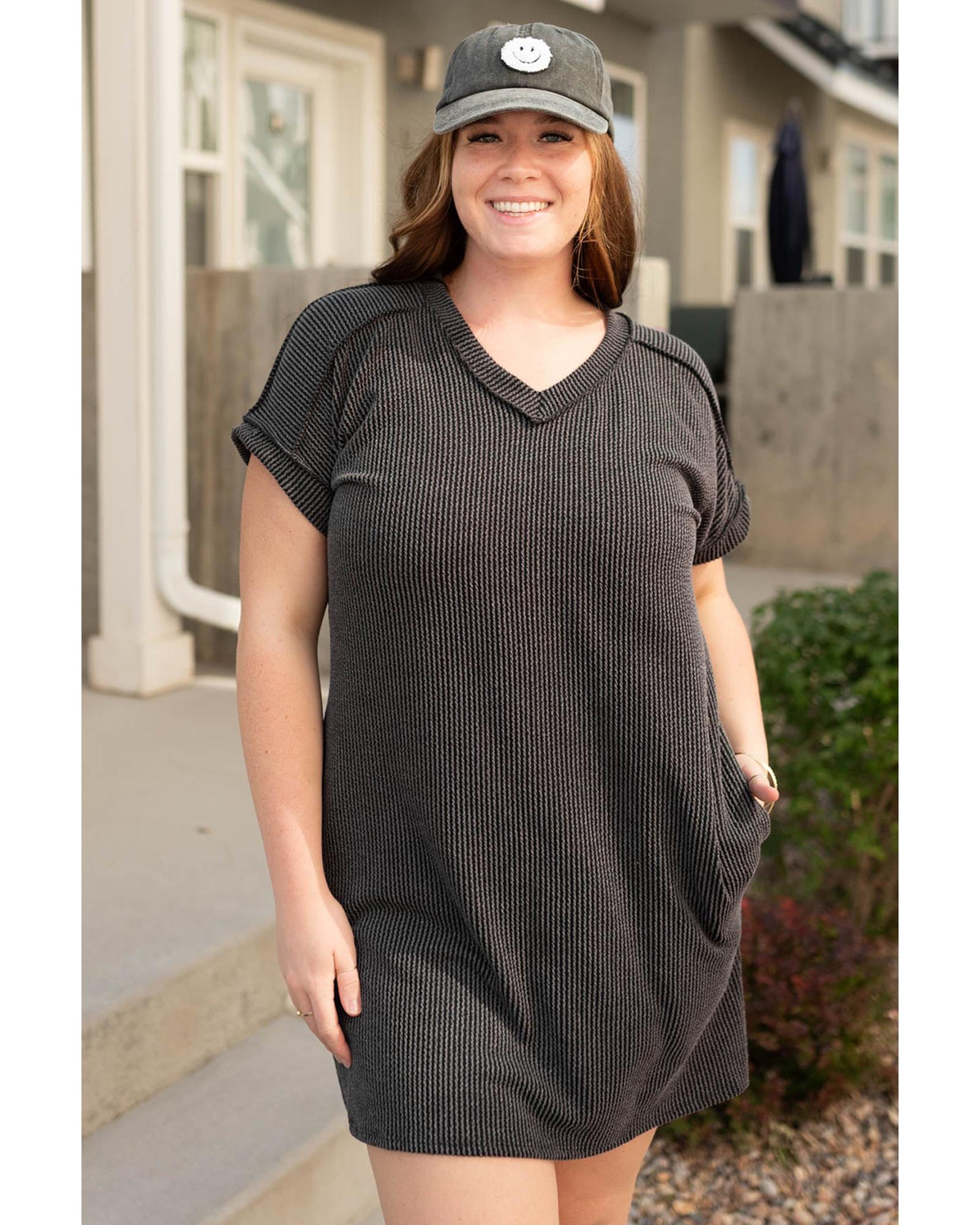 Carbon Grey Corded V Neck Plus Size T Shirt Dress with Pockets – 3X