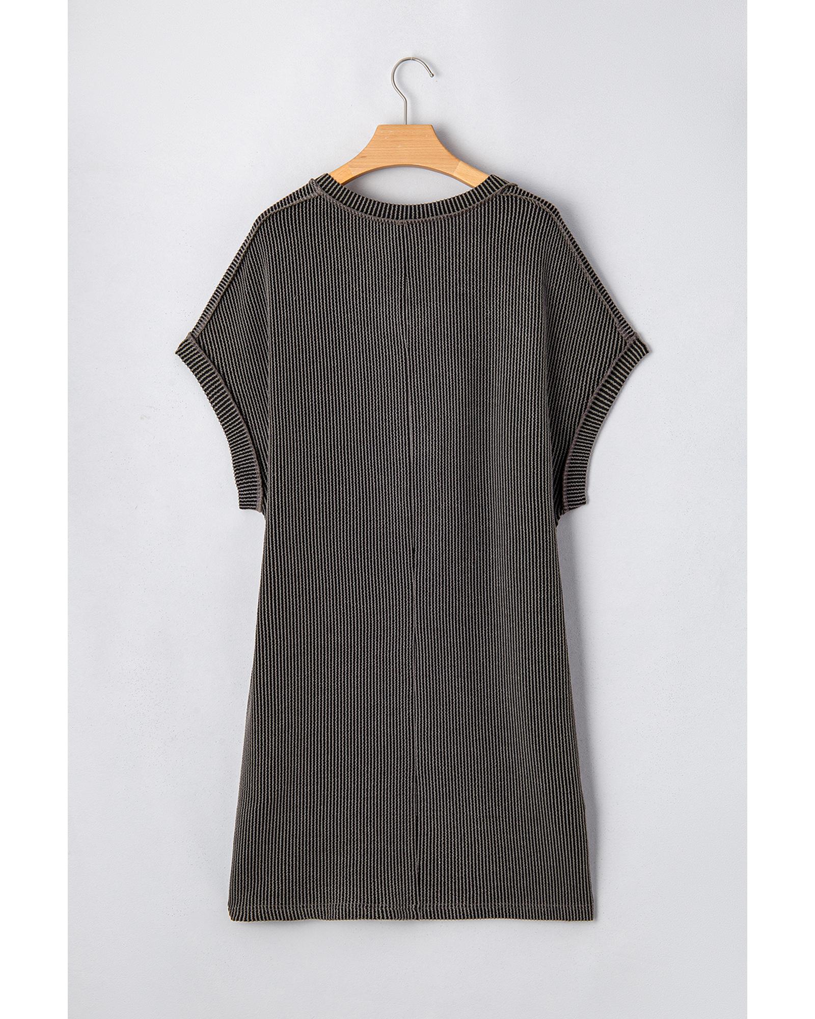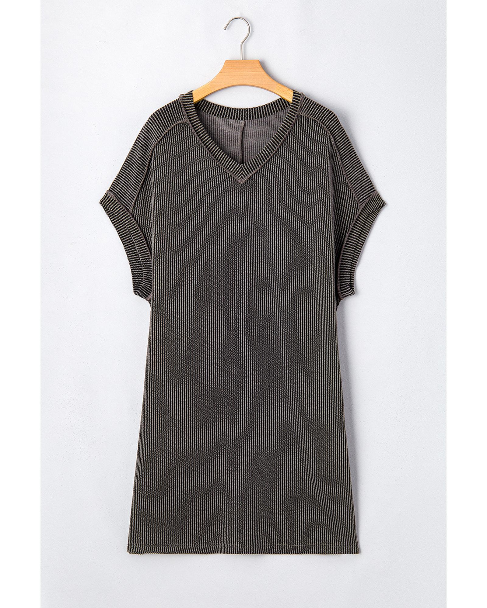 Carbon Grey Corded V Neck Plus Size T Shirt Dress with Pockets - 2X