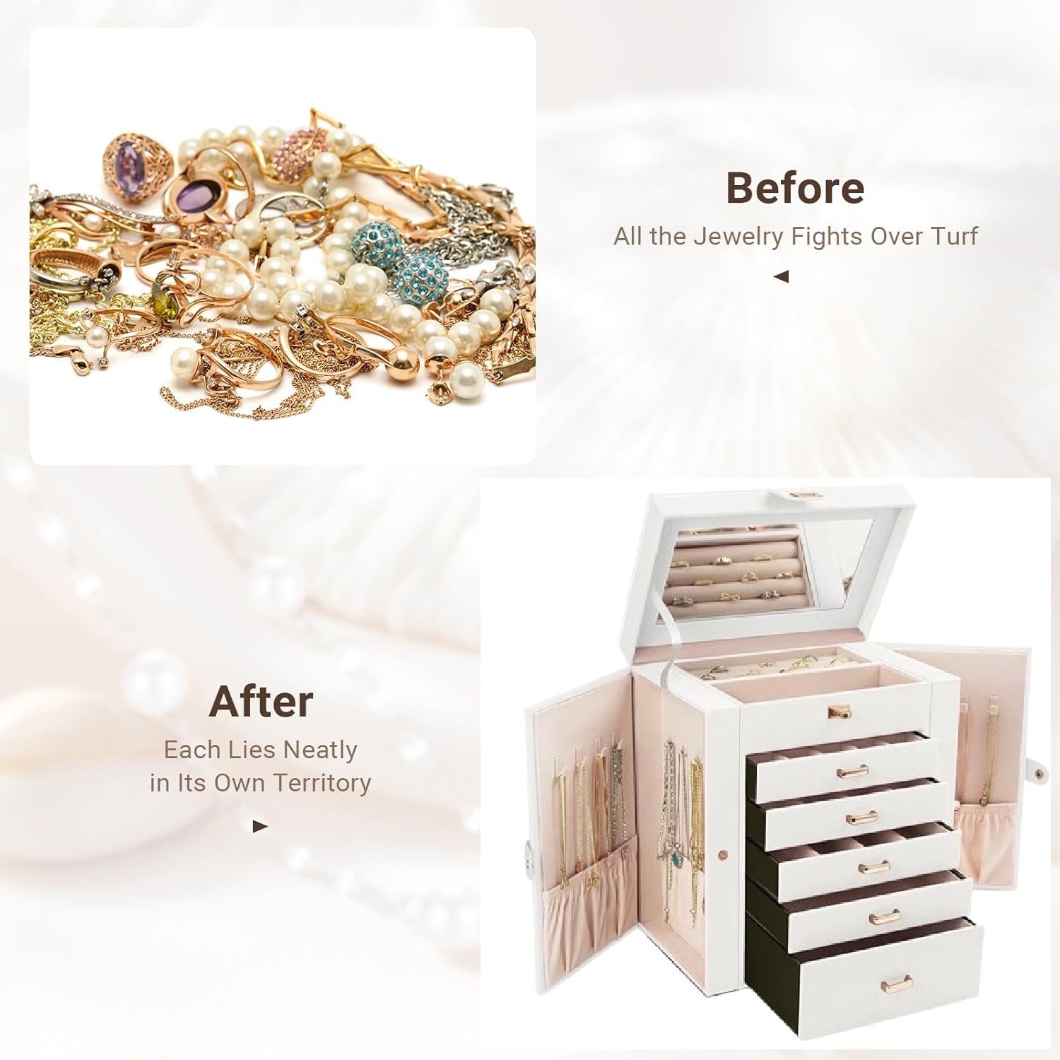 - SPACIOUS 6-LAYER DESIGN: Features 6 drawers, ring slots, and 2 side compartments with 16 necklace hooks—perfectly designed to store rings, earrings, bracelets, watches, sunglasses, and more without tangling or clutter.
