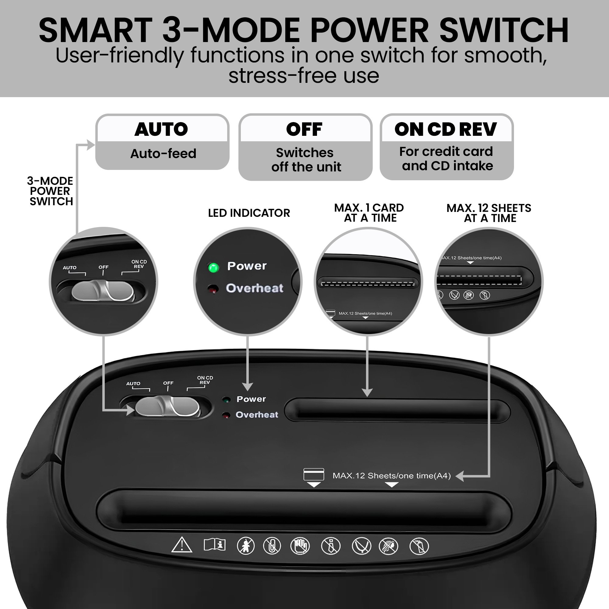 - Can shred up to 12 sheets (80GSM) per pass