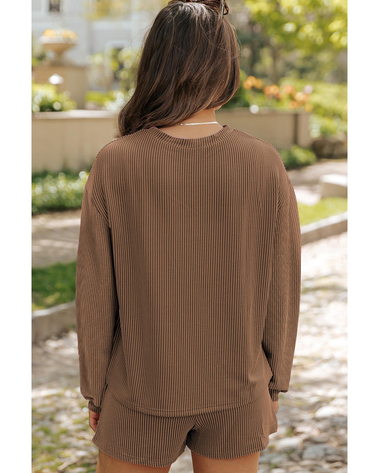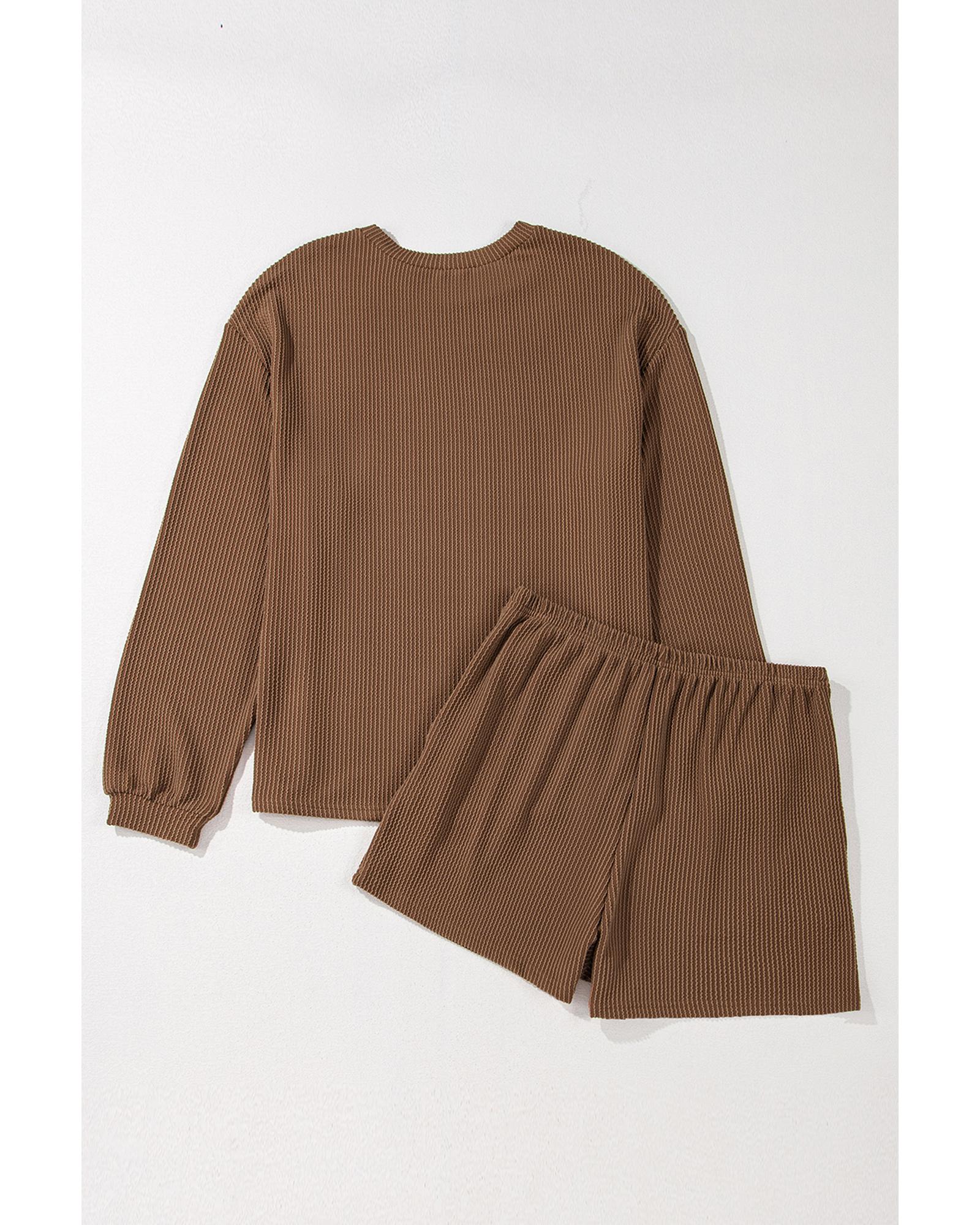 - Chestnut Corded Knit Long Sleeve Top and High Waist Shorts Set