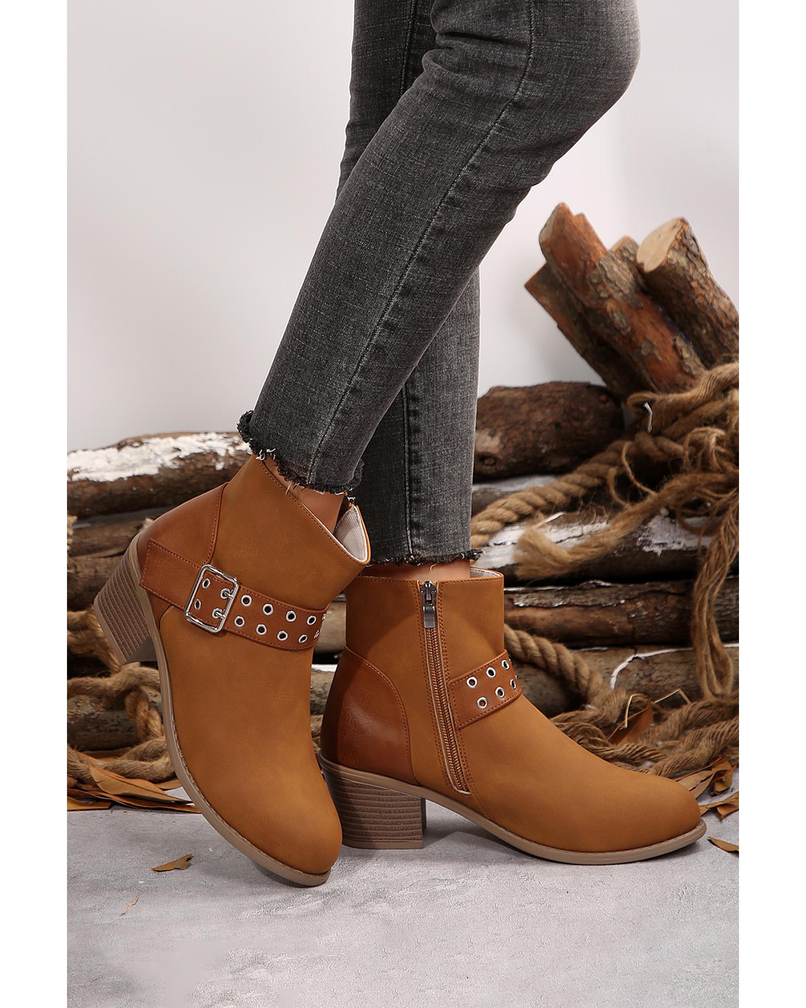Chestnut Eyelet Buckled Chunky Heel Faux Leather Ankle Boots – 37 EU
