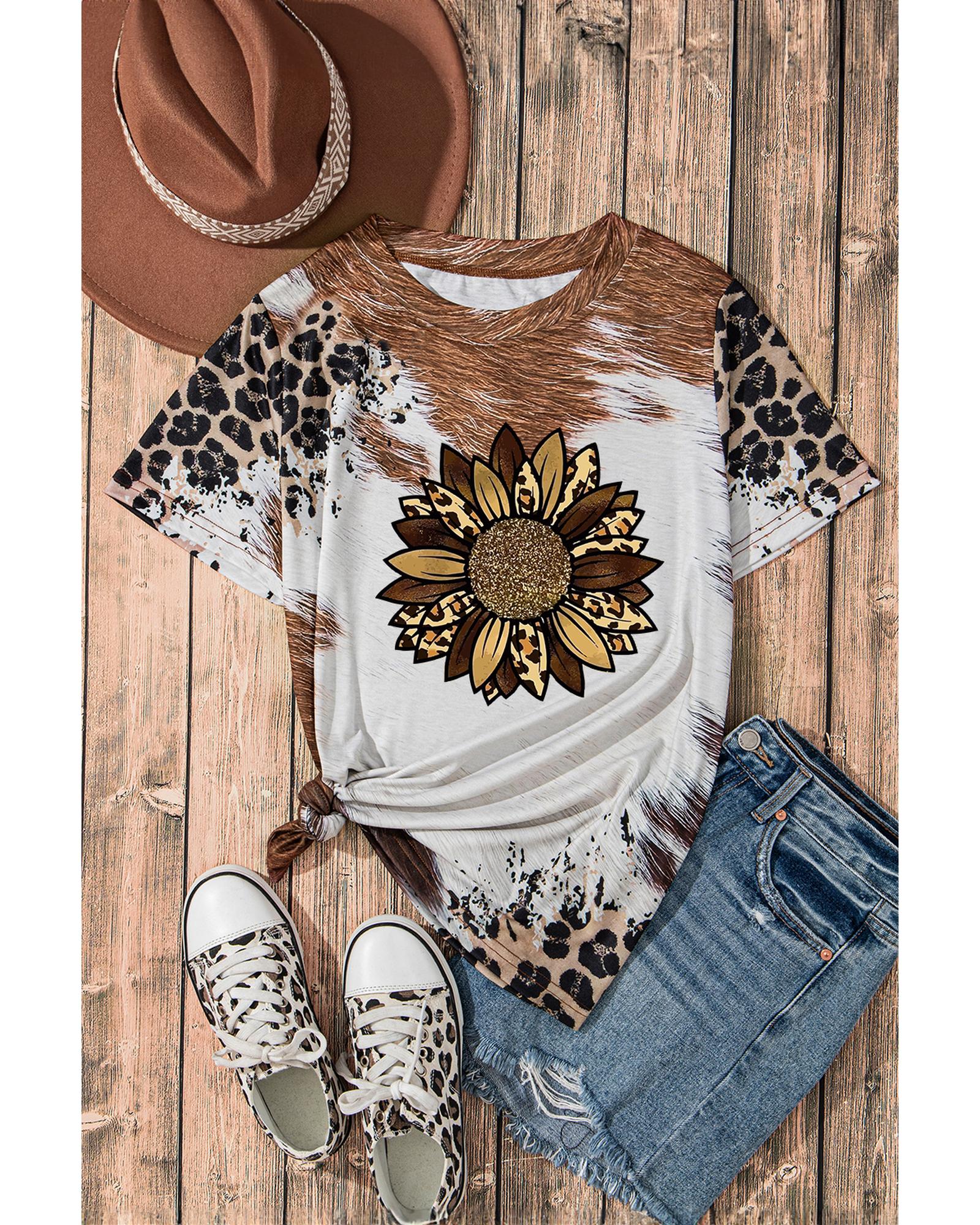 - Chestnut Leopard Bleached Sunflower Graphic Crewneck T