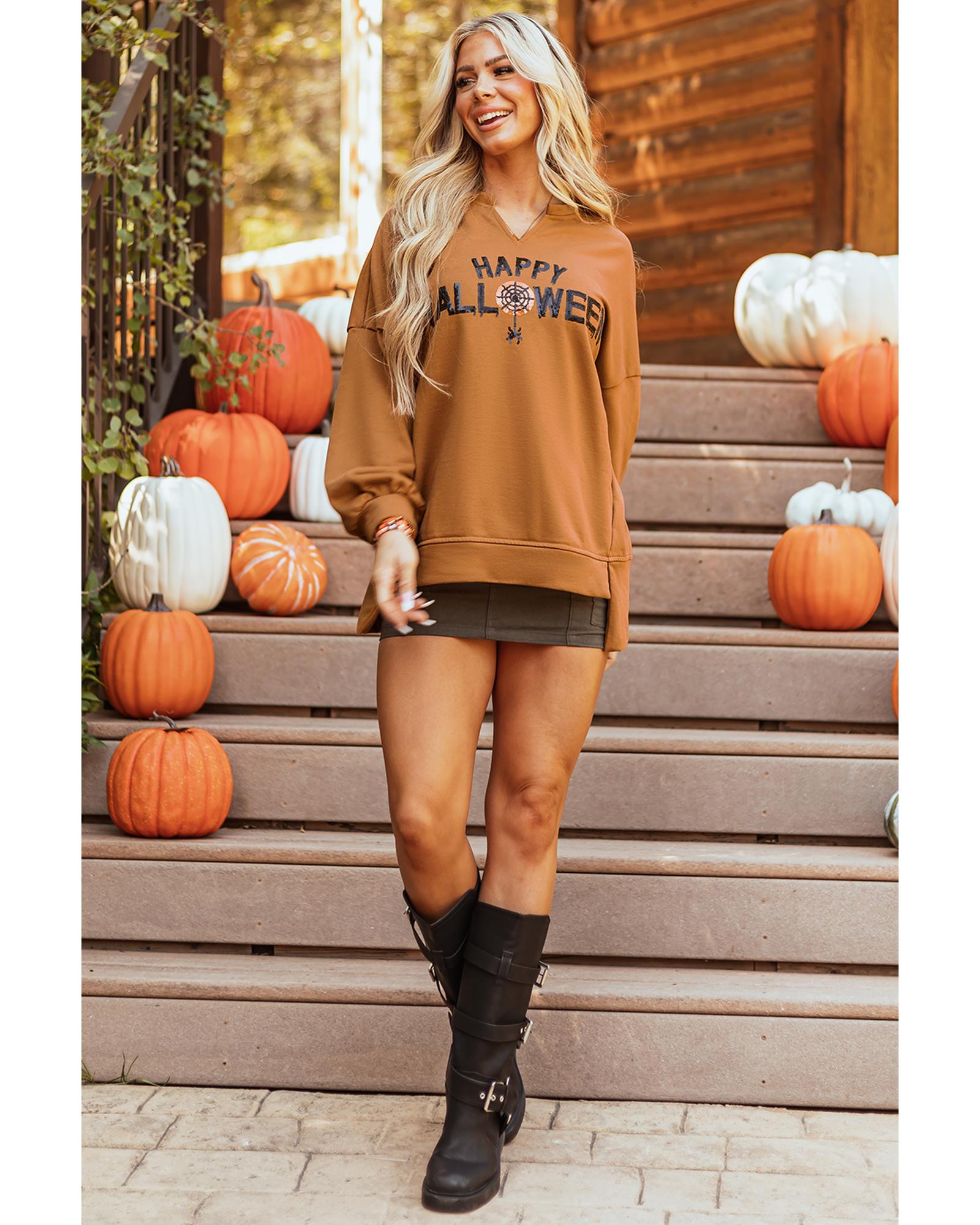 Chestnut Sequin Happy Halloween Graphic Notched Neck Long Sleeve Loose Top – 2XL