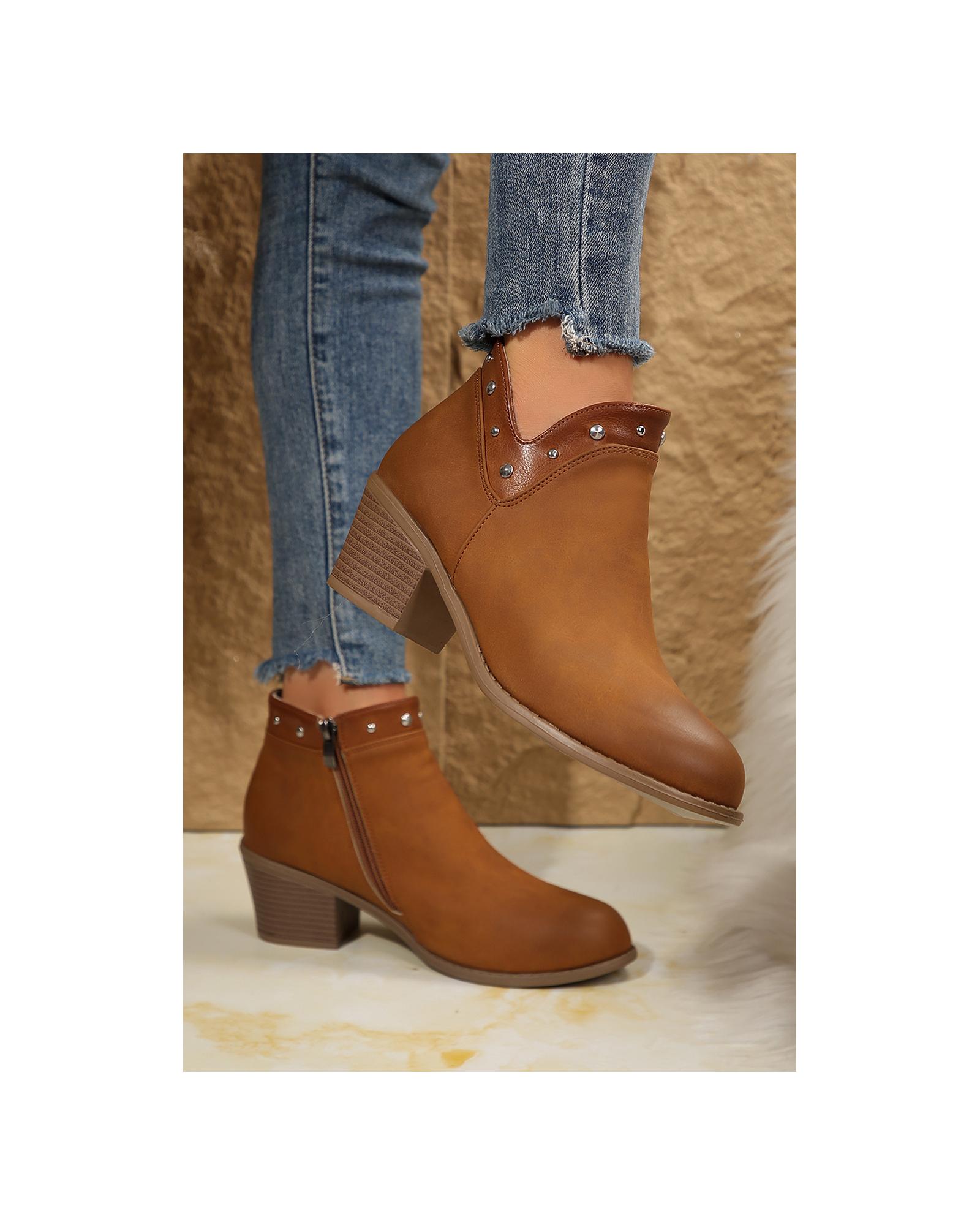 Chestnut Studded Faux Leather Chunky Heel Ankle Boots – 39 EU