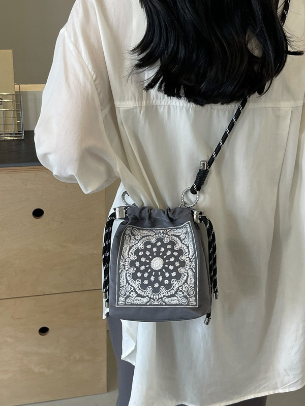 Chic Drawstring Bucket Bag with Intricate Print – Adjustable Rope Strap, Lightweight Fabric