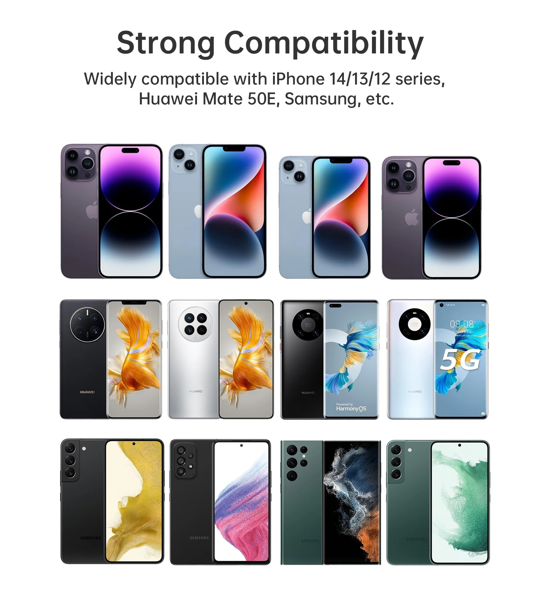 This power bank delivers optimized charging to a wide variety of mobile devices, including phones, tablets and more – like the iPhone Series 12, 13 and 14, Huawei Mate 50E, Samsung Galaxy S21, S22, S23