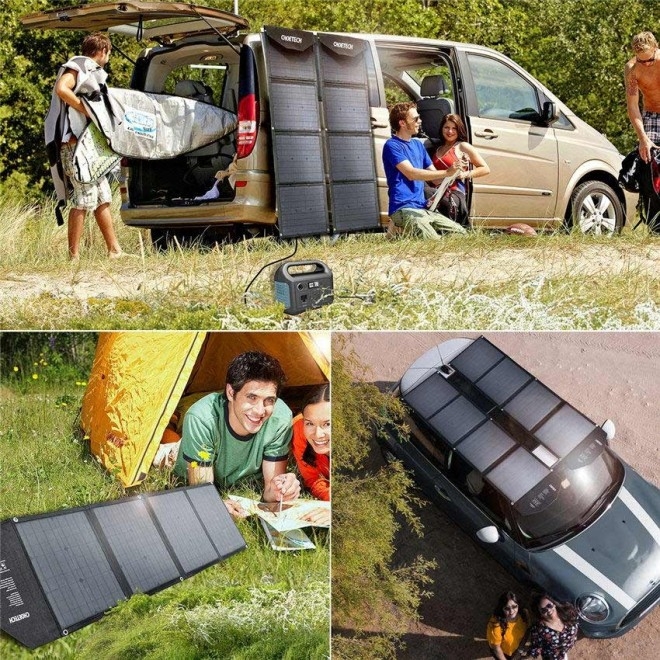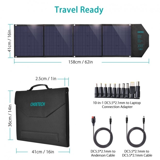 CHOETECH 80W folding solar panel can charge your power station directly from sunlight with the 10-in-1 connector kit (except for MacBooks). With 3 USB ports (USB-A1: QC3.0, Support Apple 5V-2.4A,USB-A2: Apple 5V-2.4A), 1 USB-C port ( C port PD30W: compatible with PD3.0), and a 80W DC output can keep two devices simultaneously full of power. Also includes a Black computer extension cable 5521 female 10 in 1.