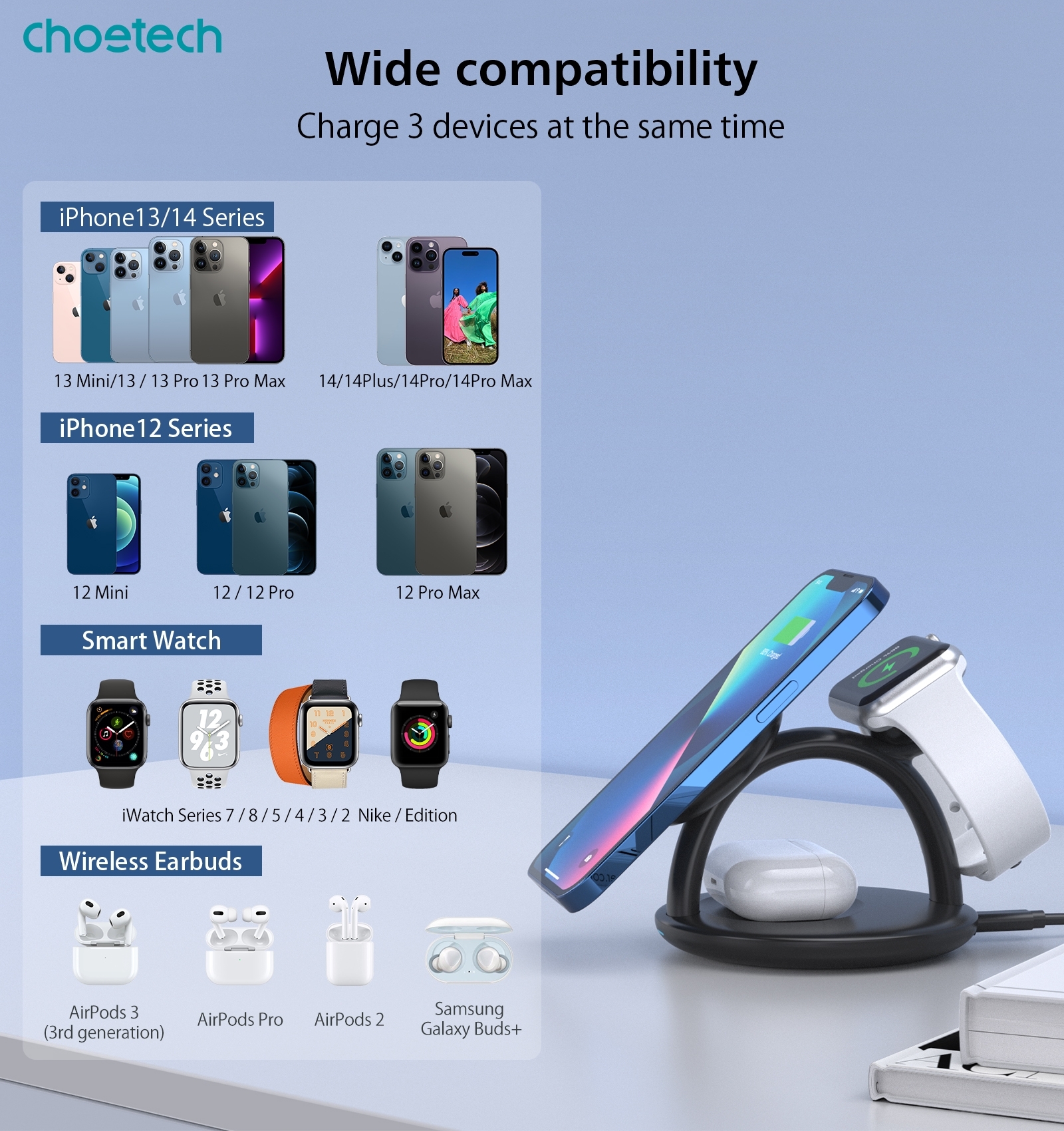 CHOETECH T587-F 3-in-1 Magnetic Wireless Charger Station for iPhone 12/13/14/AirPods Pro/iWatch
