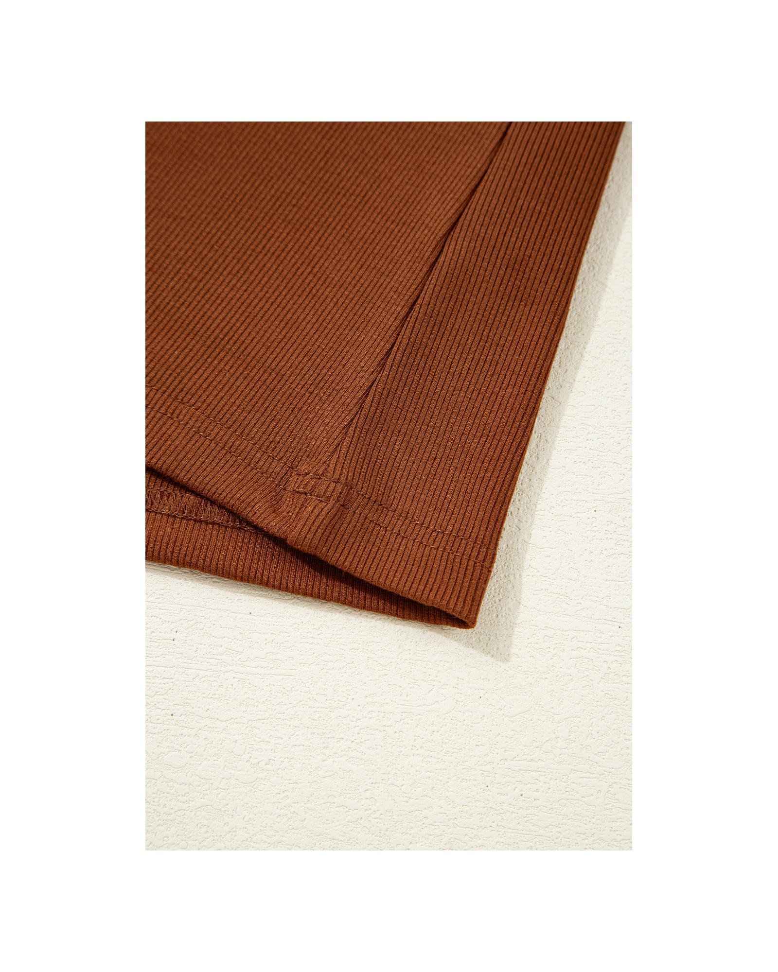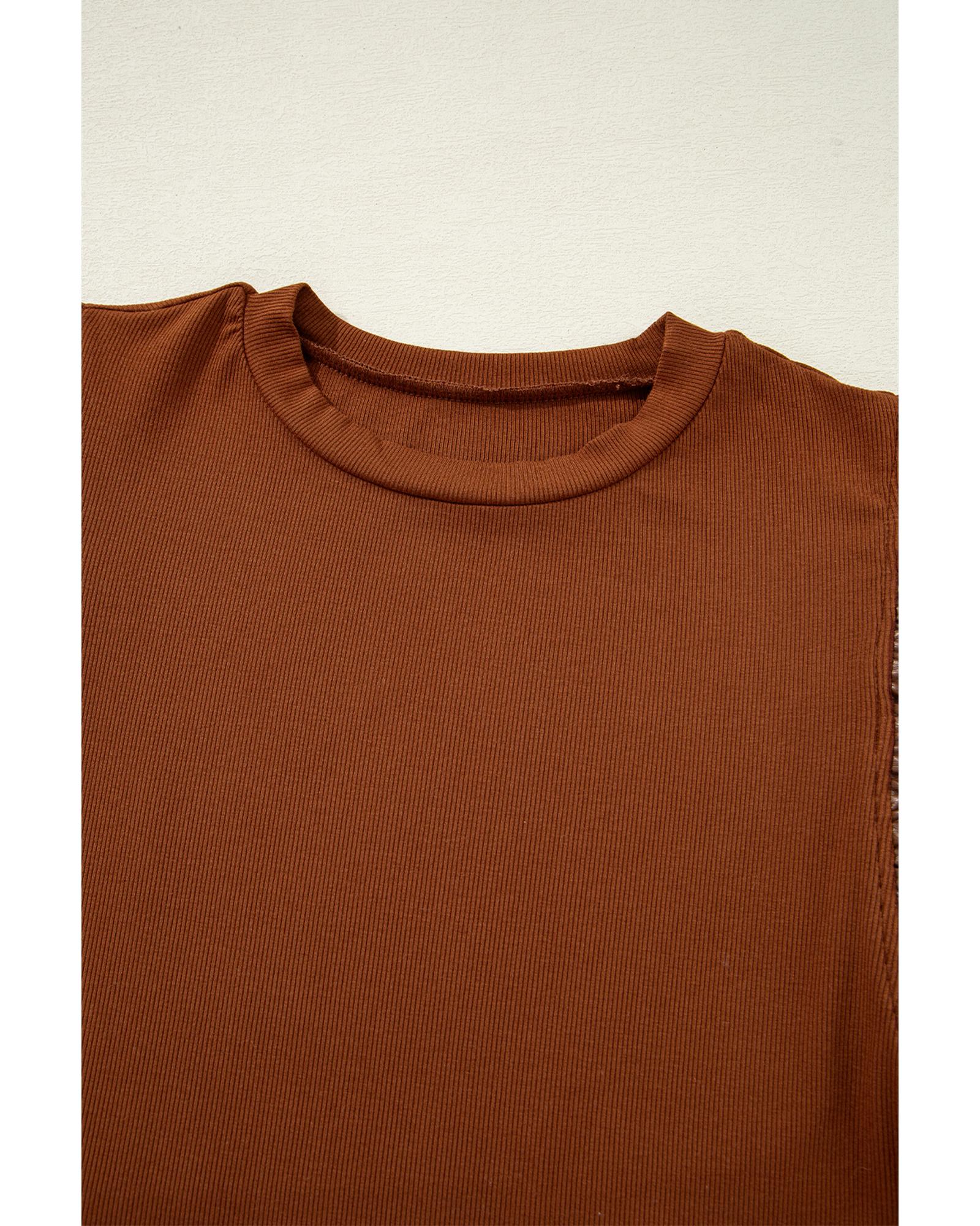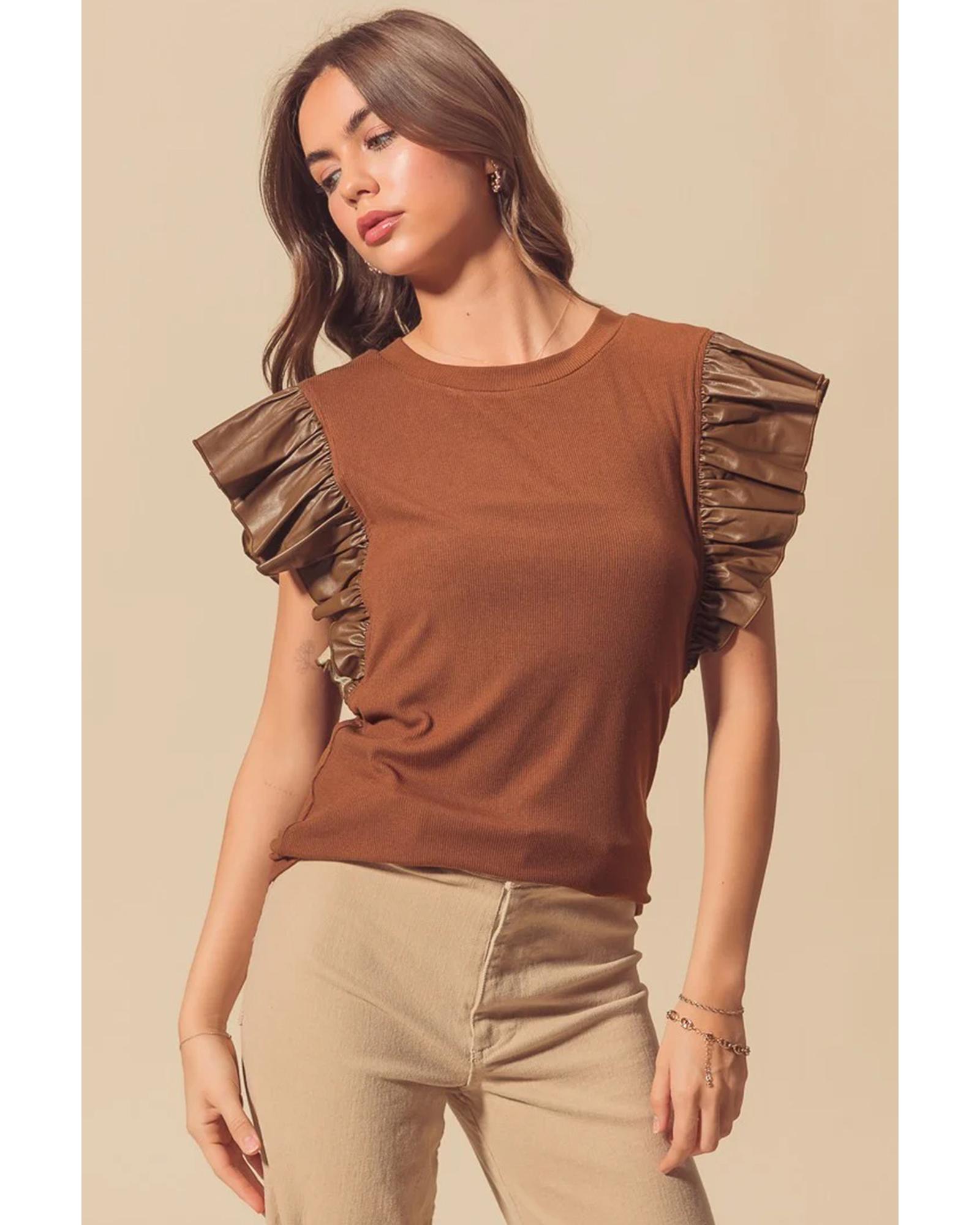 Cinnamon Leather Ruffle Sleeve Patchwork Round Neck Blouse – XL