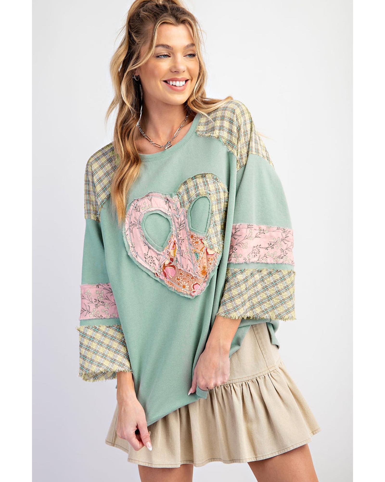 Clearly Aqua Plaid Floral Peace Heart Graphic Wide Long Sleeve Top – L