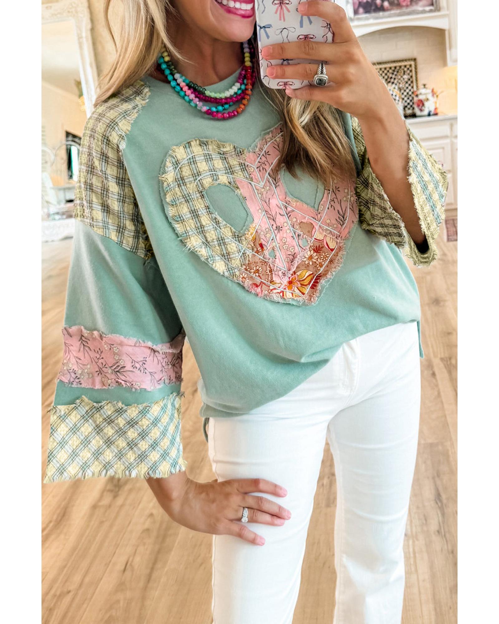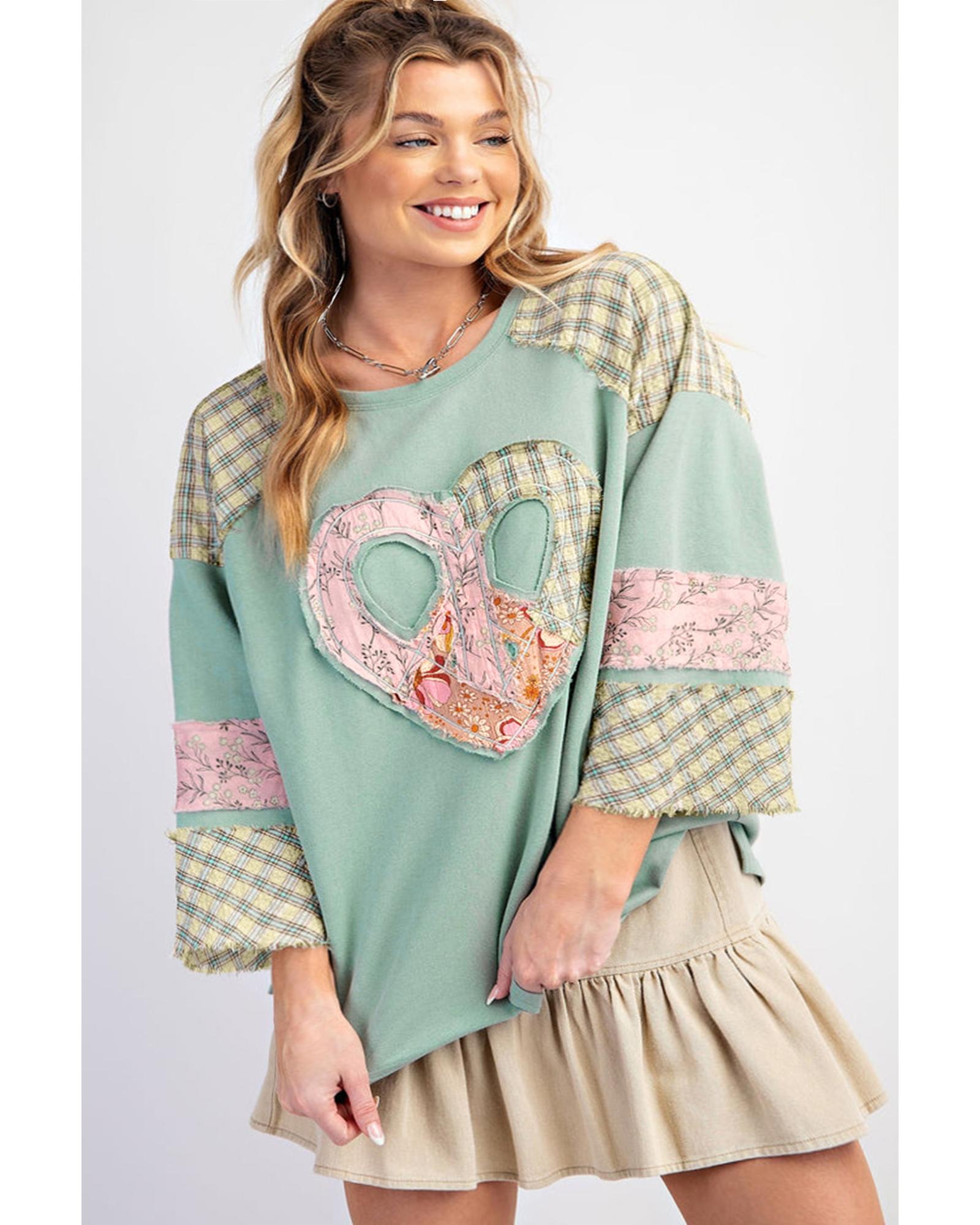 Clearly Aqua Plaid Floral Peace Heart Graphic Wide Long Sleeve Top – S