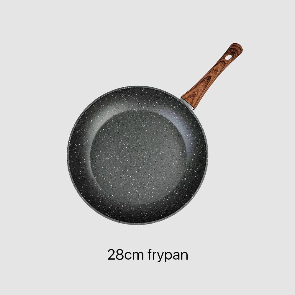 - Set includes a 24cm and 28cm frypans, 16cm and 20cm saucepan with lids, and a 24cm casserole dish