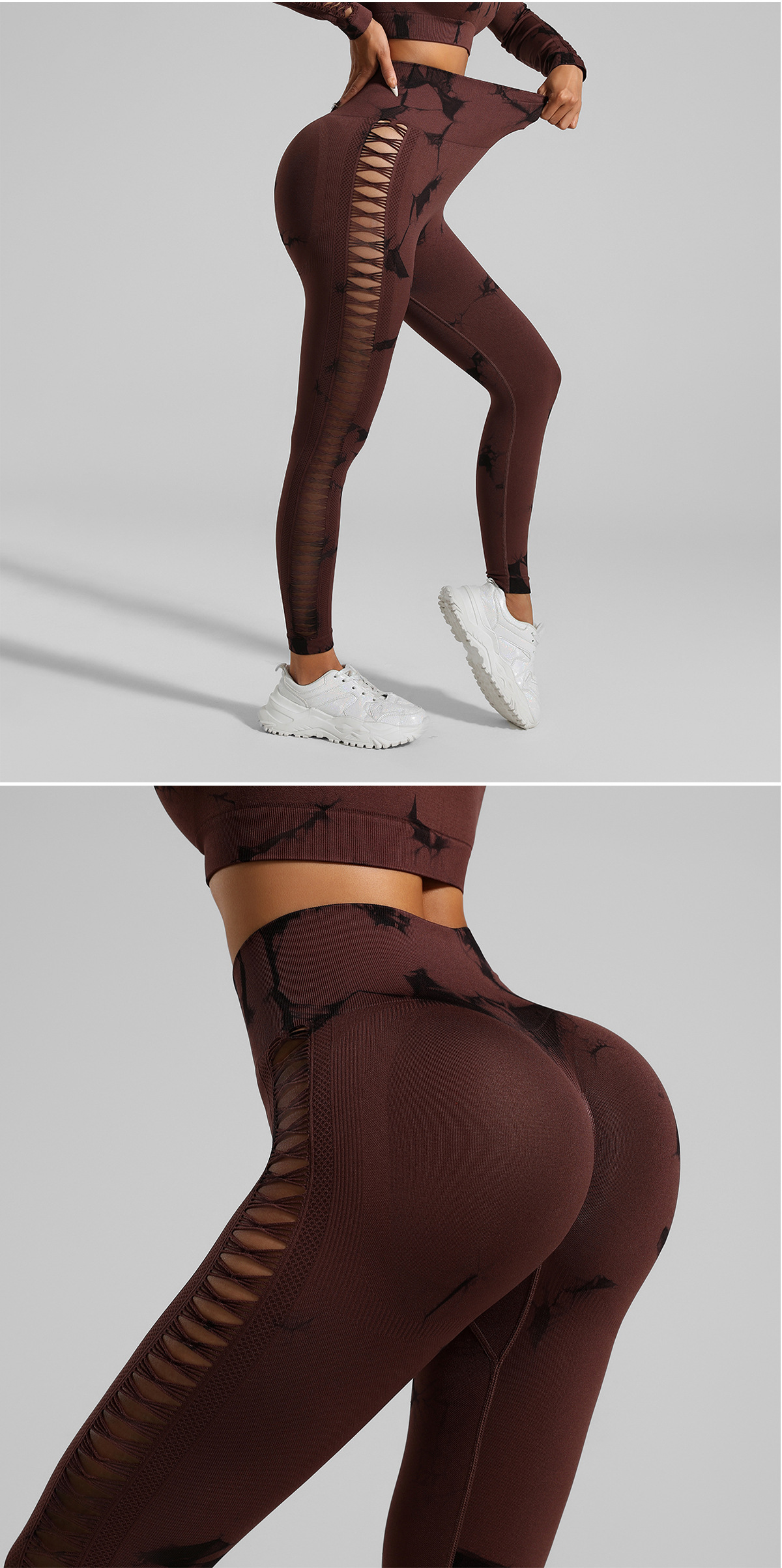 Coffee and Black Tie-Dye Size S Tie-Dye Yoga Set Long Sleeve Butt Lift Leggings Seamless Workout Training Gym Clothes
