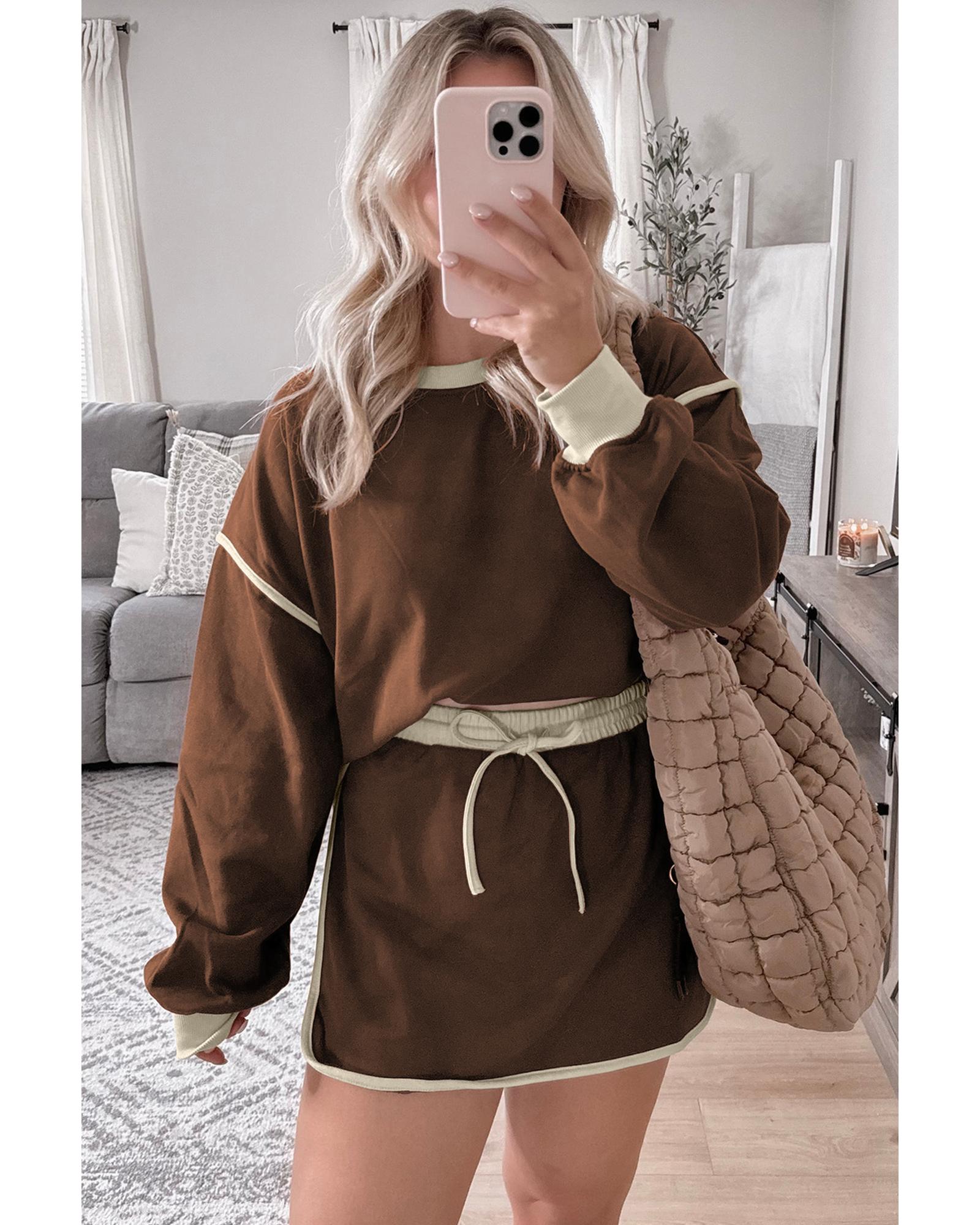 Coffee Color Contrast Loose Pullover and Lace-up Waist Skort Set – L