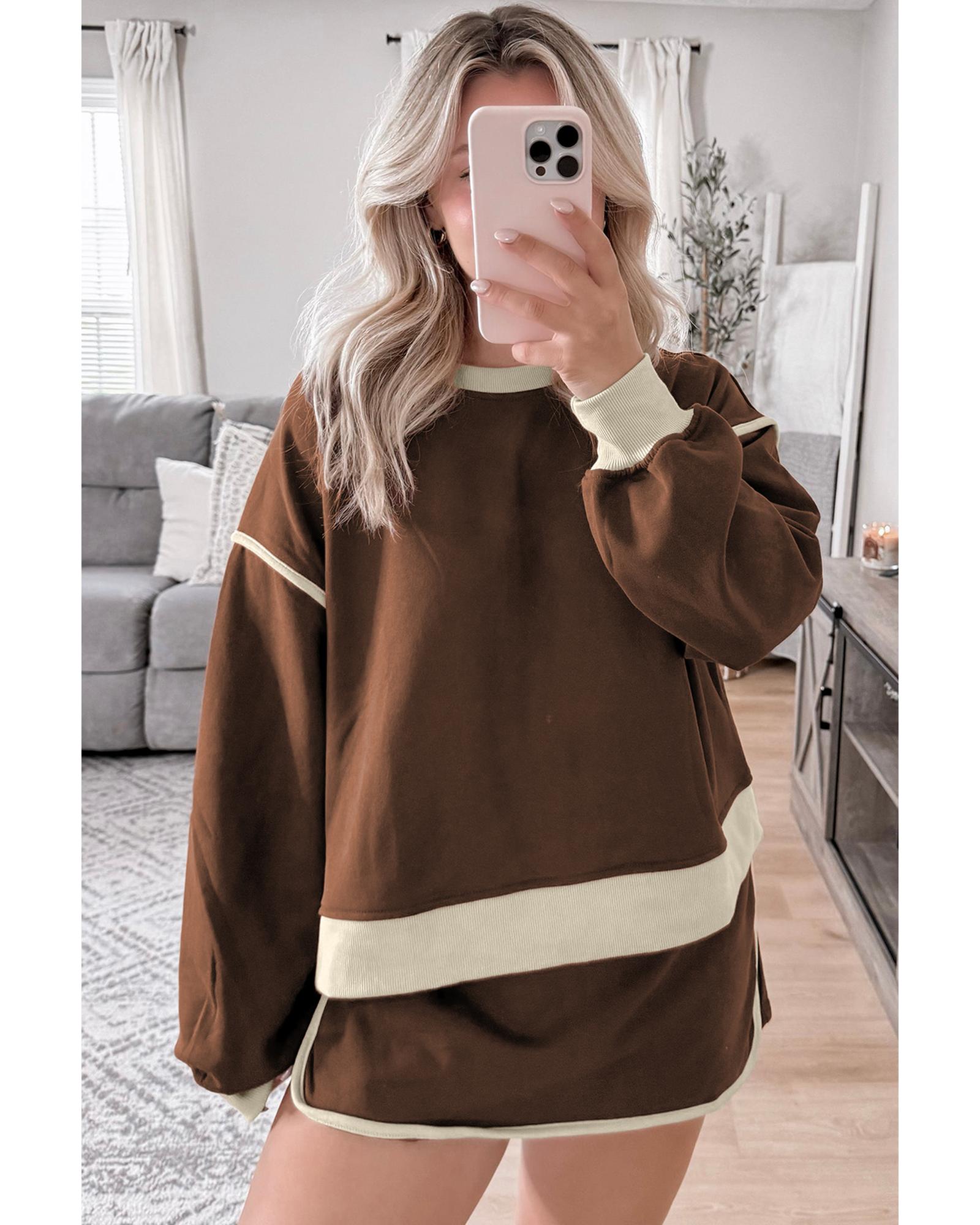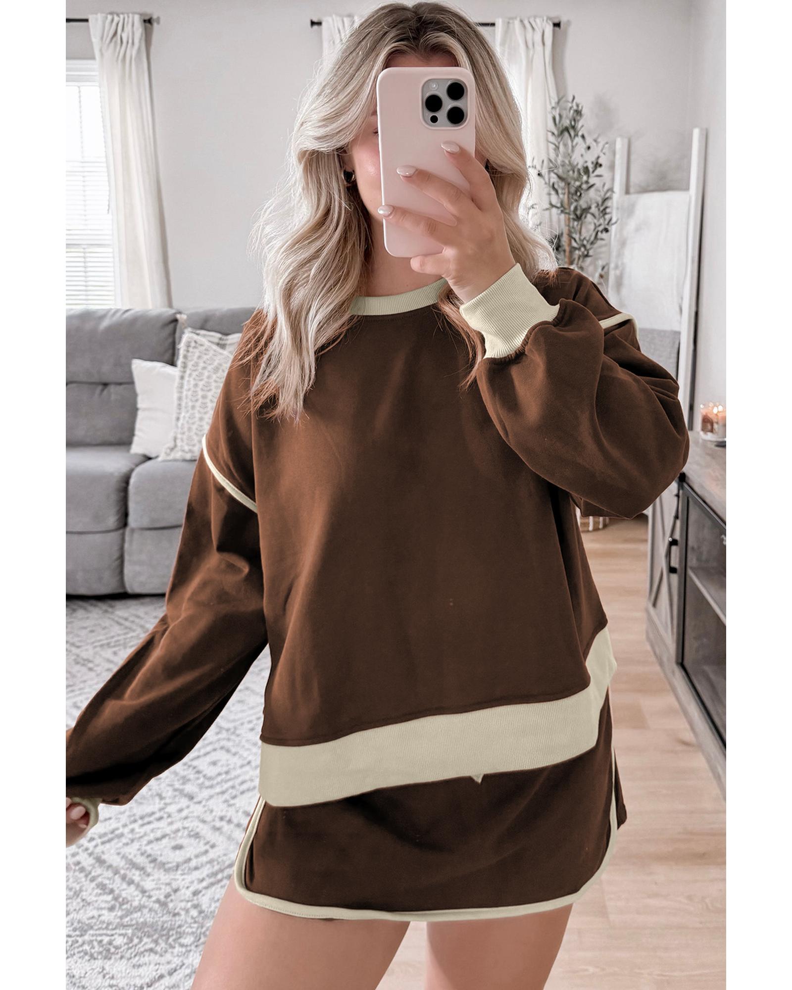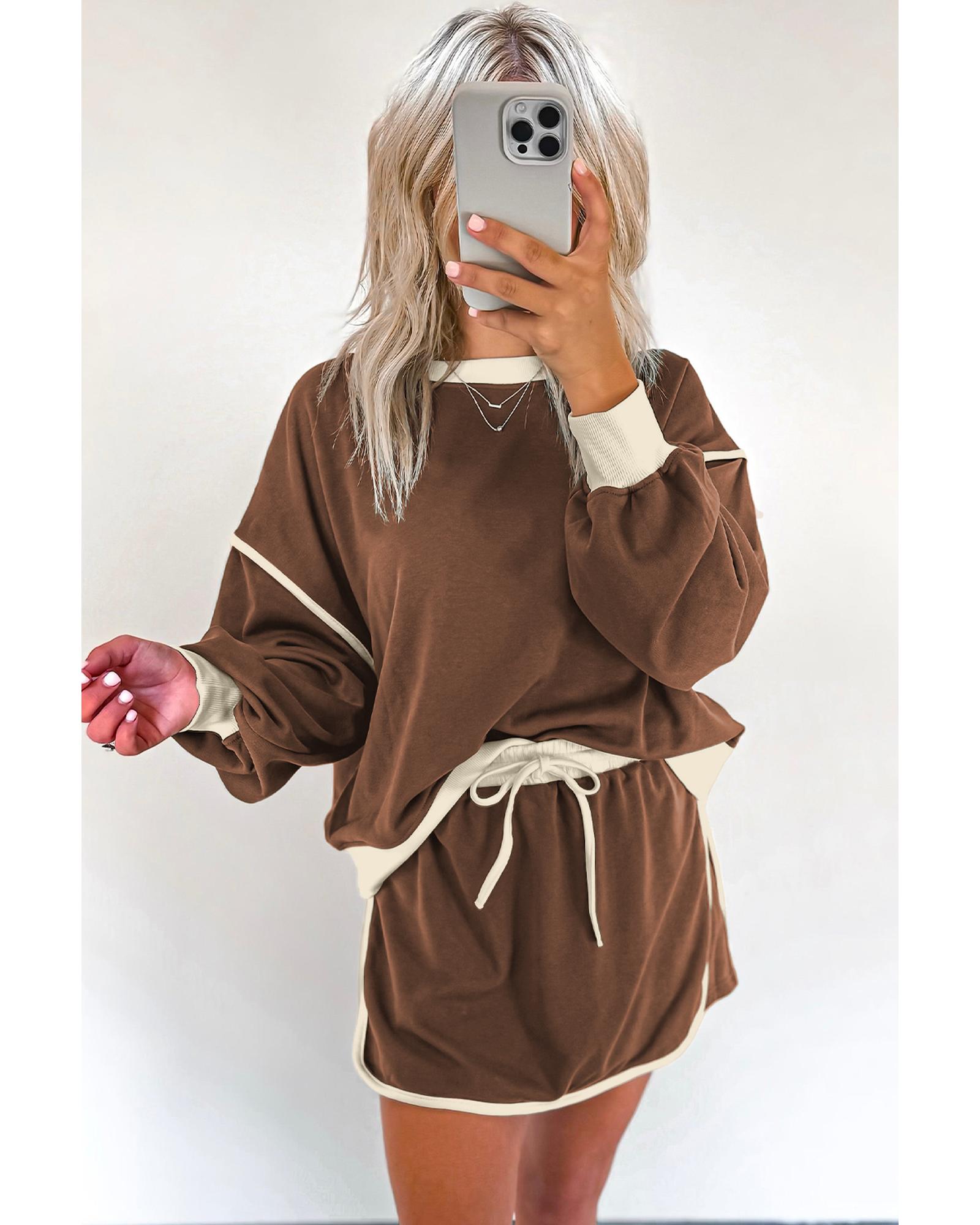 Coffee Color Contrast Loose Pullover and Lace-up Waist Skort Set – XL