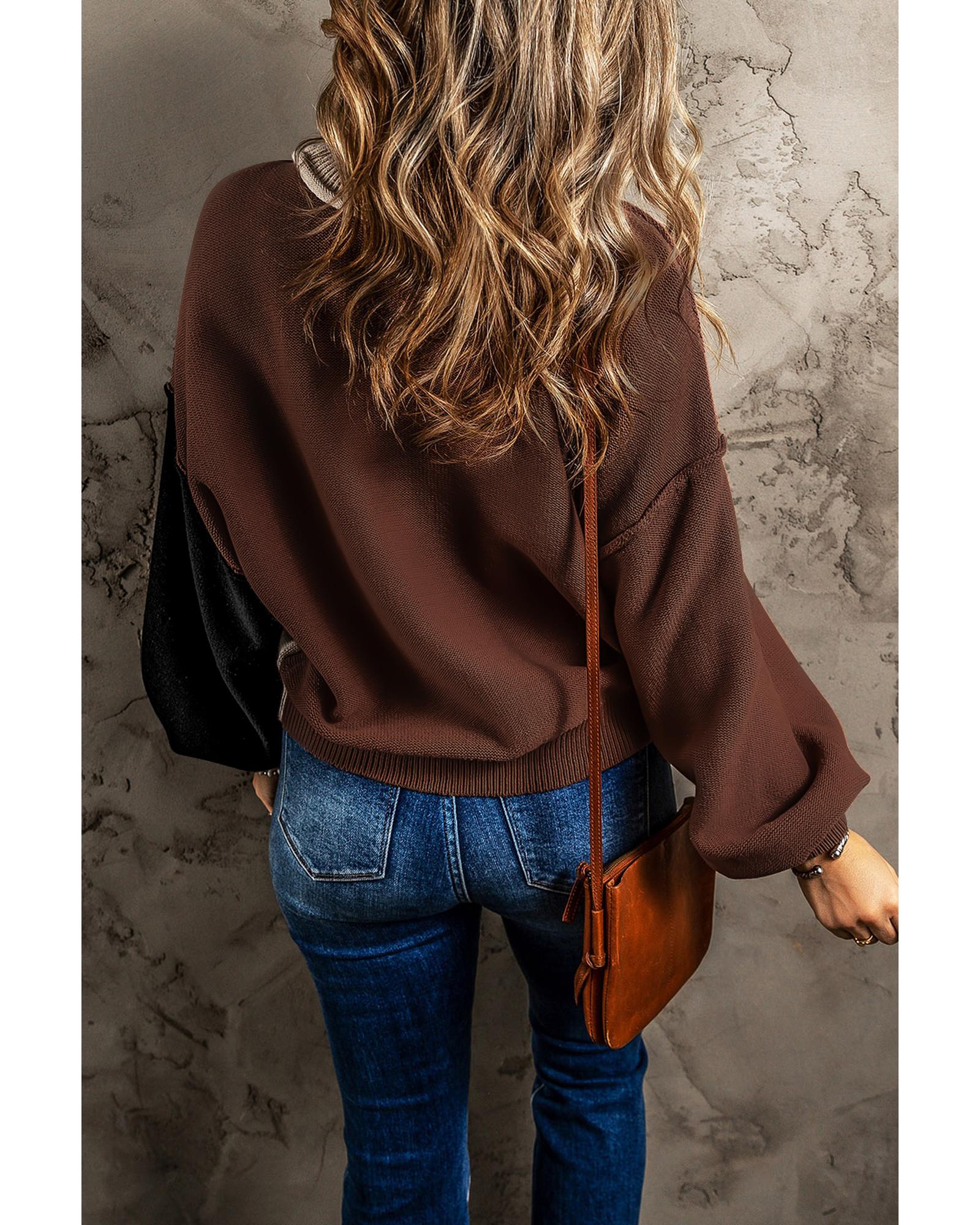 Coffee Colorblock Bishop Sleeve Ribbed Trim Sweater – XL
