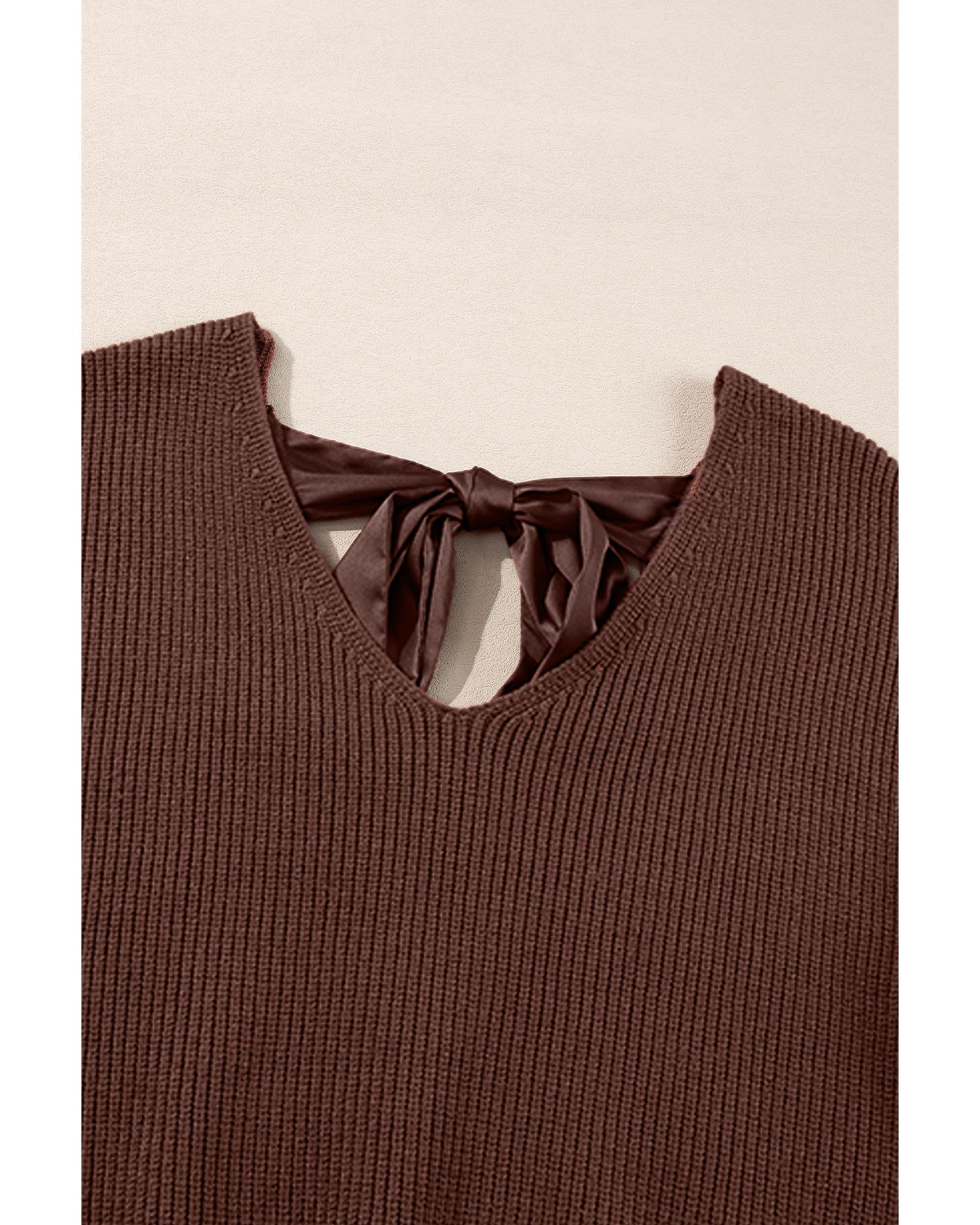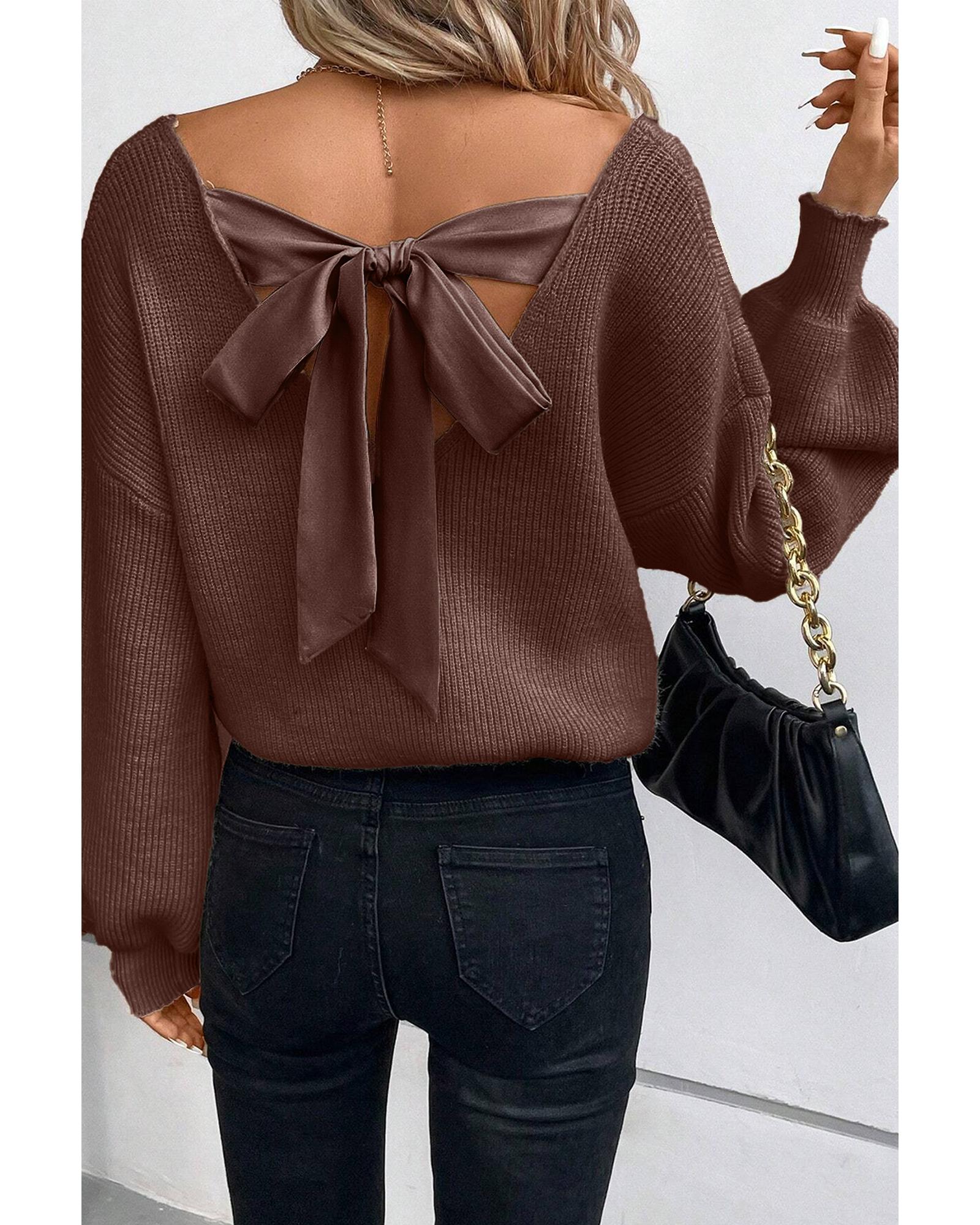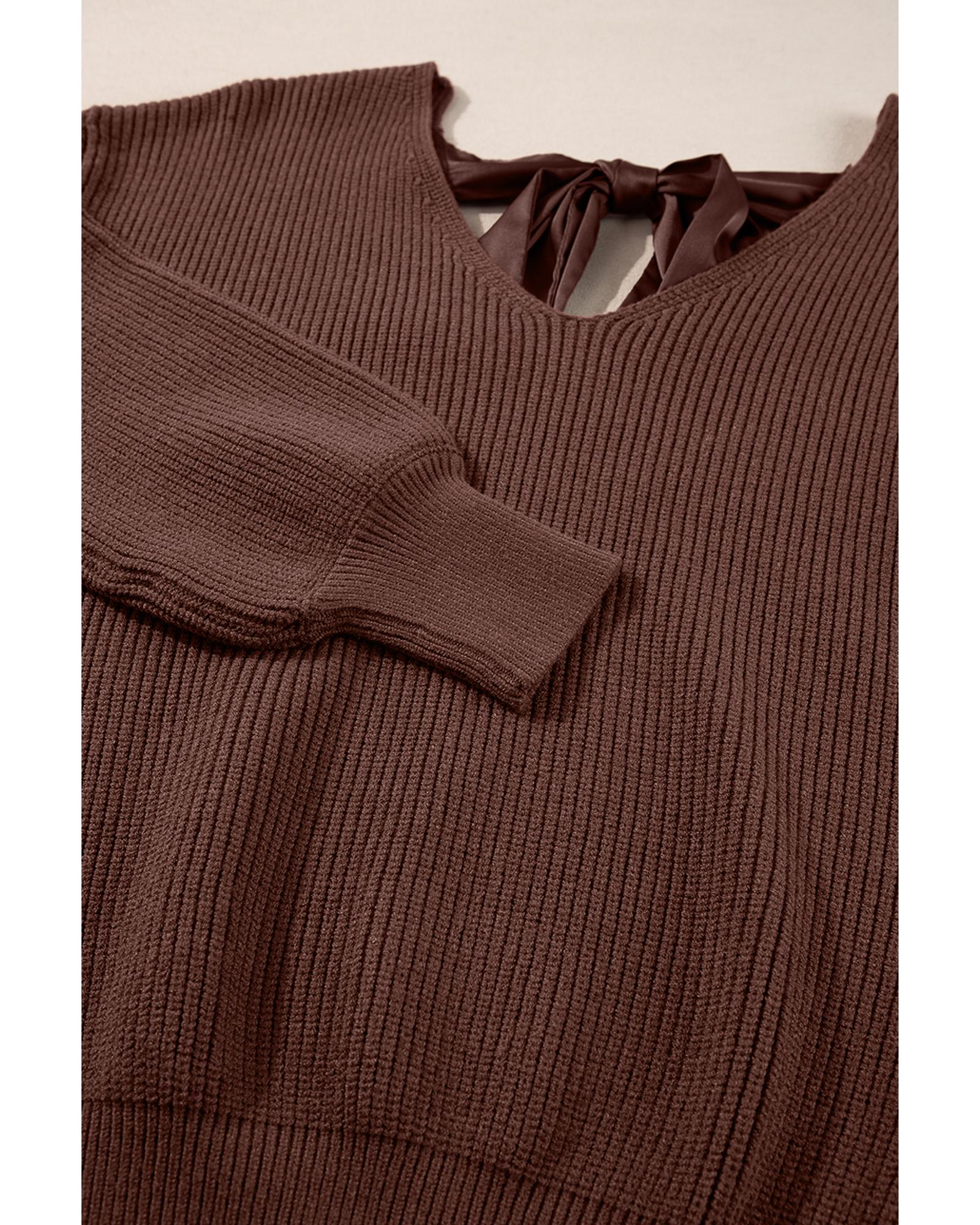 Coffee Lantern Sleeve V Neck Knot Back Sweater – L