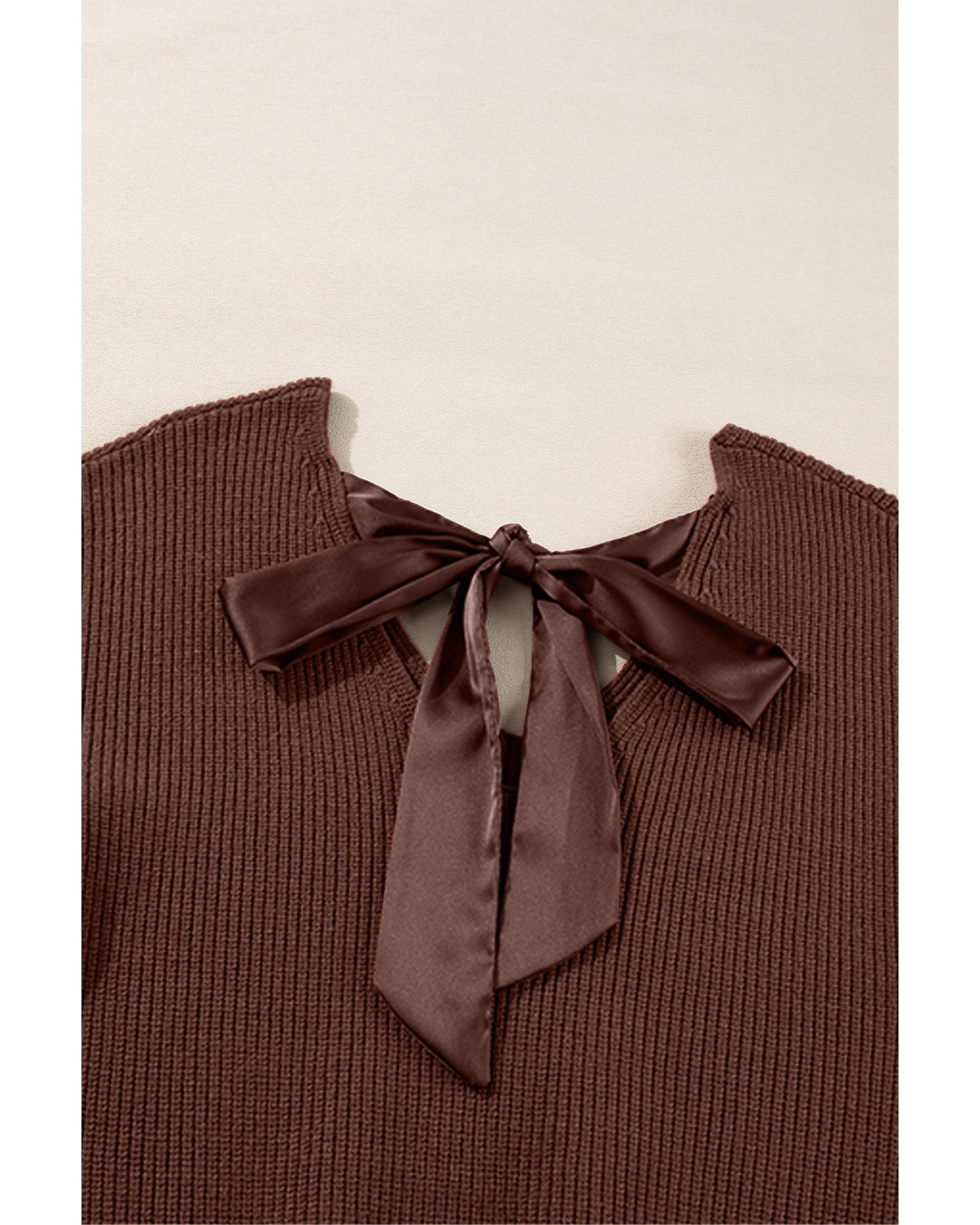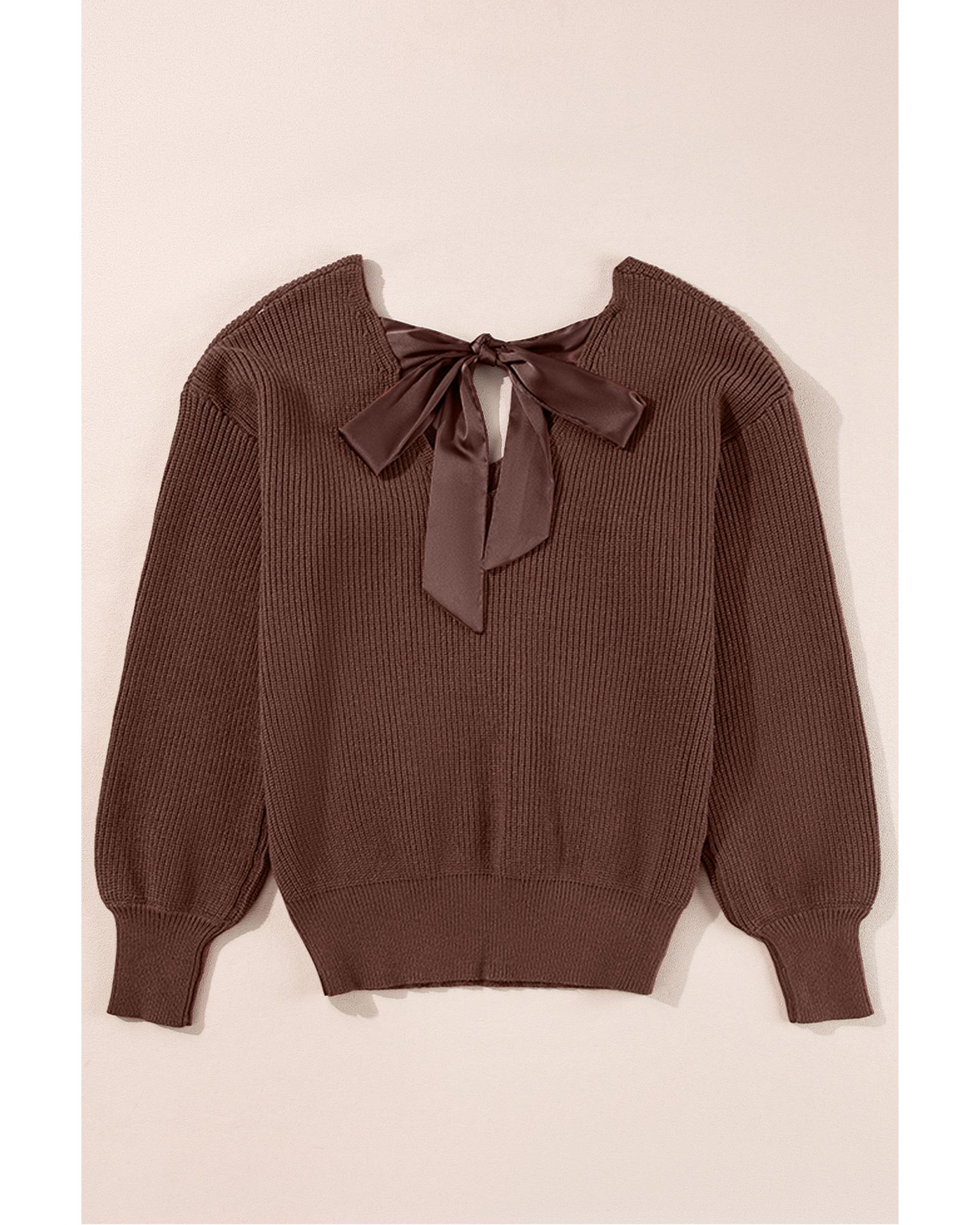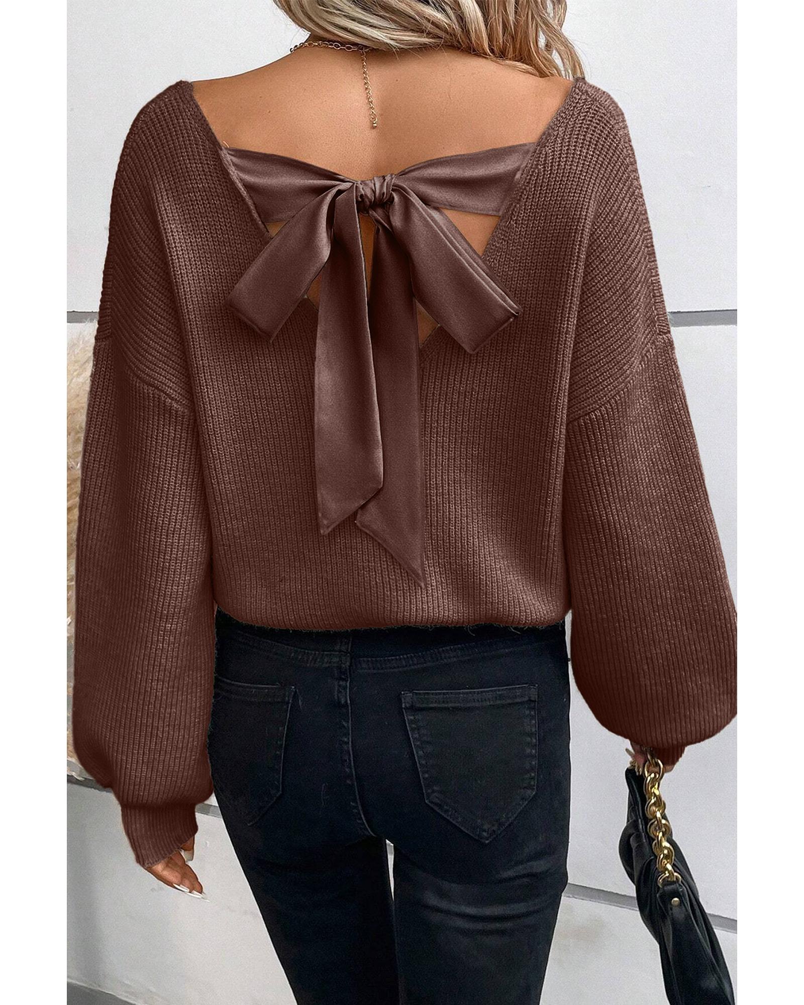 Coffee Lantern Sleeve V Neck Knot Back Sweater – L