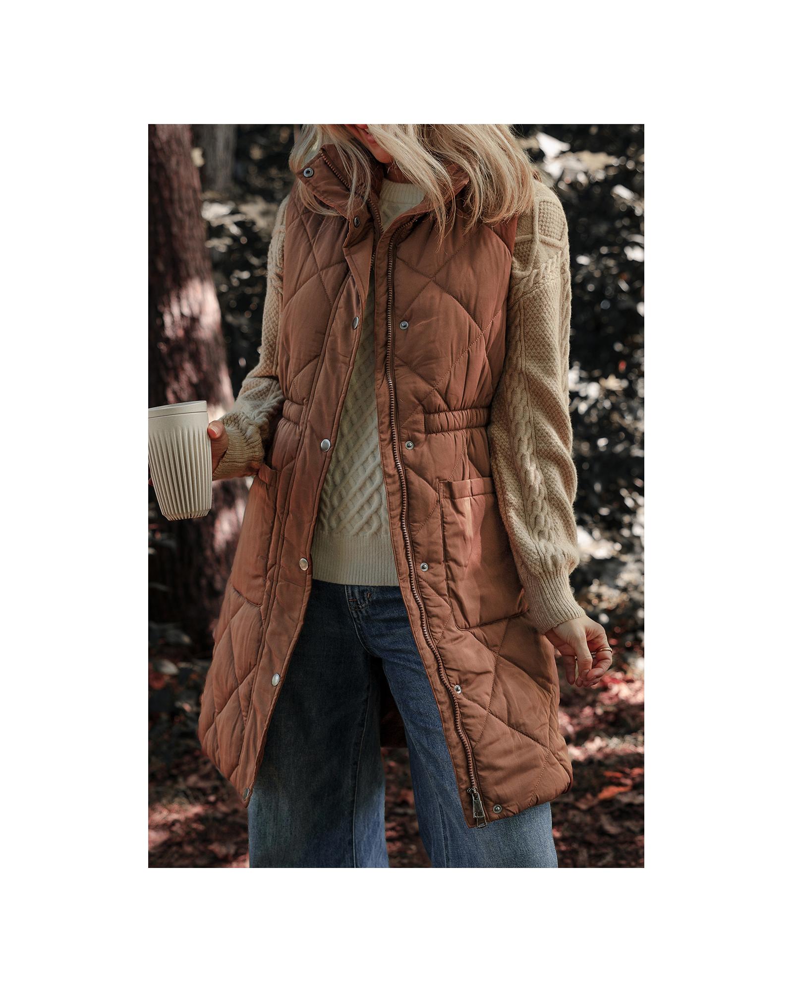 Coffee Longline Quilted Stand Collar Puffer Vest – L