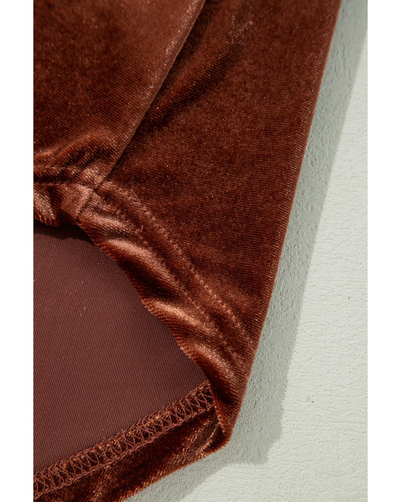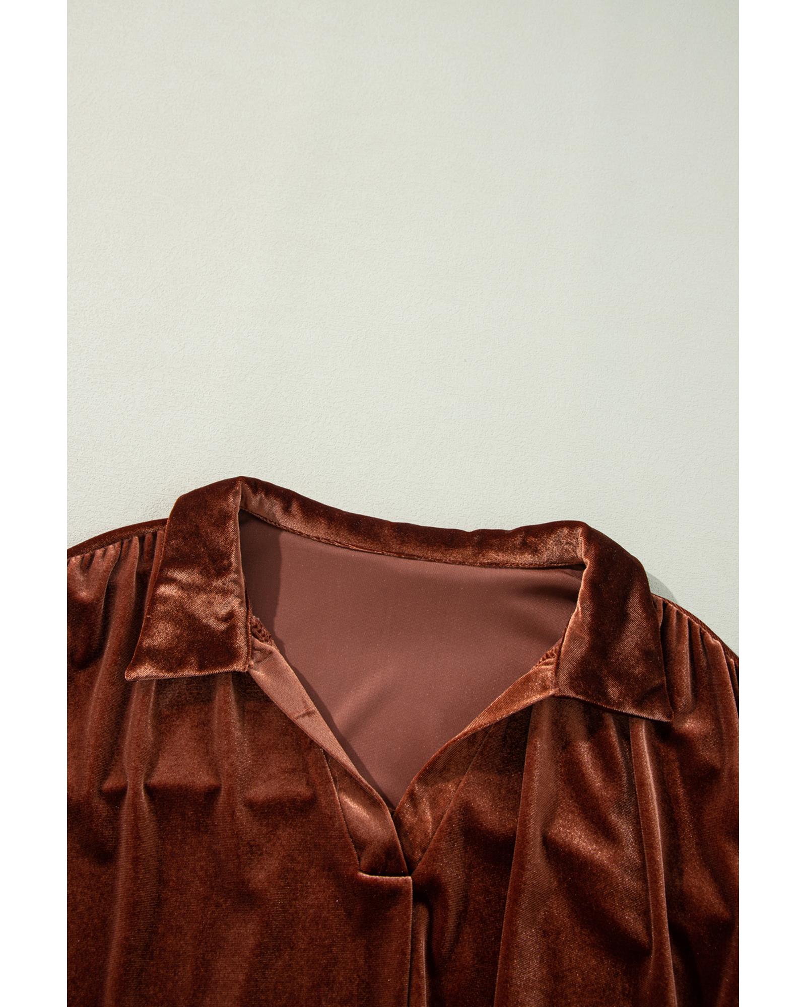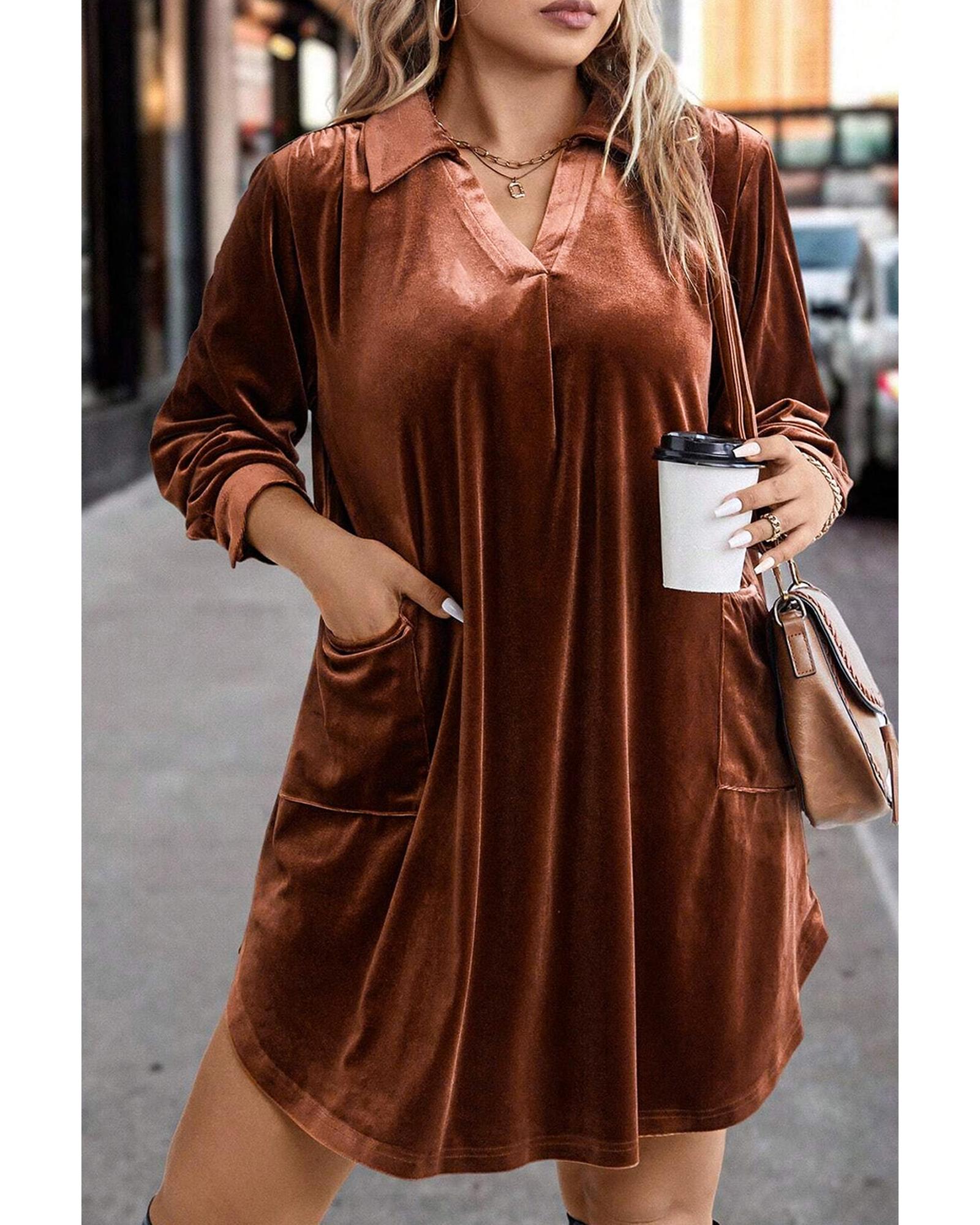 Coffee Plus Size V Neck Collared Pleated Back Rounded Hem Velvet Dress – 2X