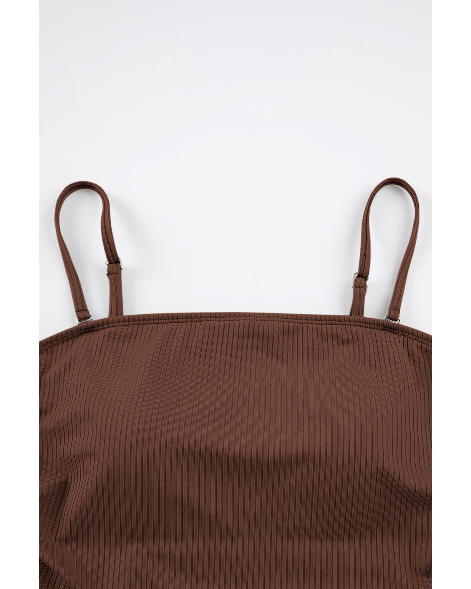 Coffee Ribbed Drawstring Sides Cutout One Piece Swimsuit – L