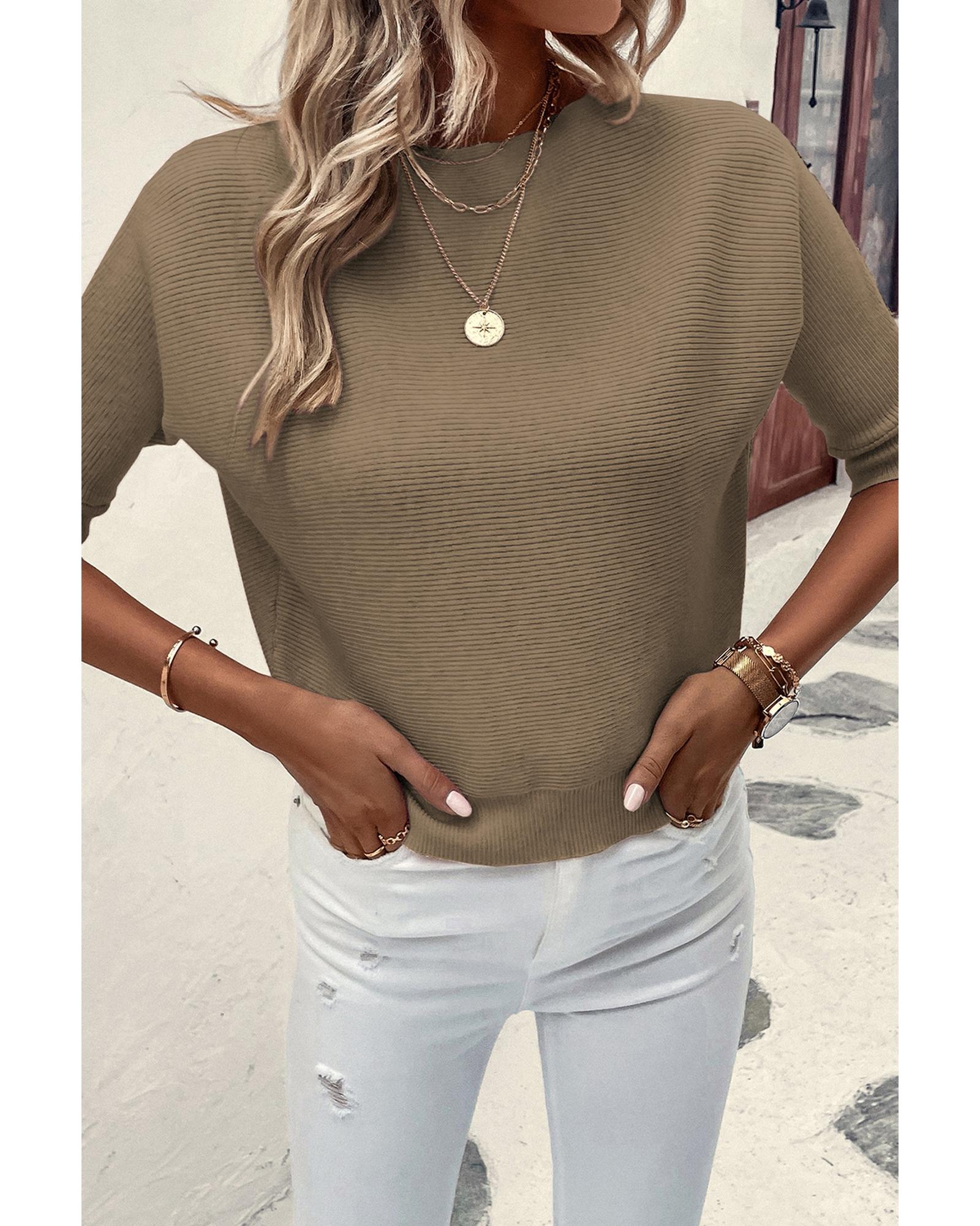 Coffee Round Neck Half Sleeve Ribbed Knit Top – L