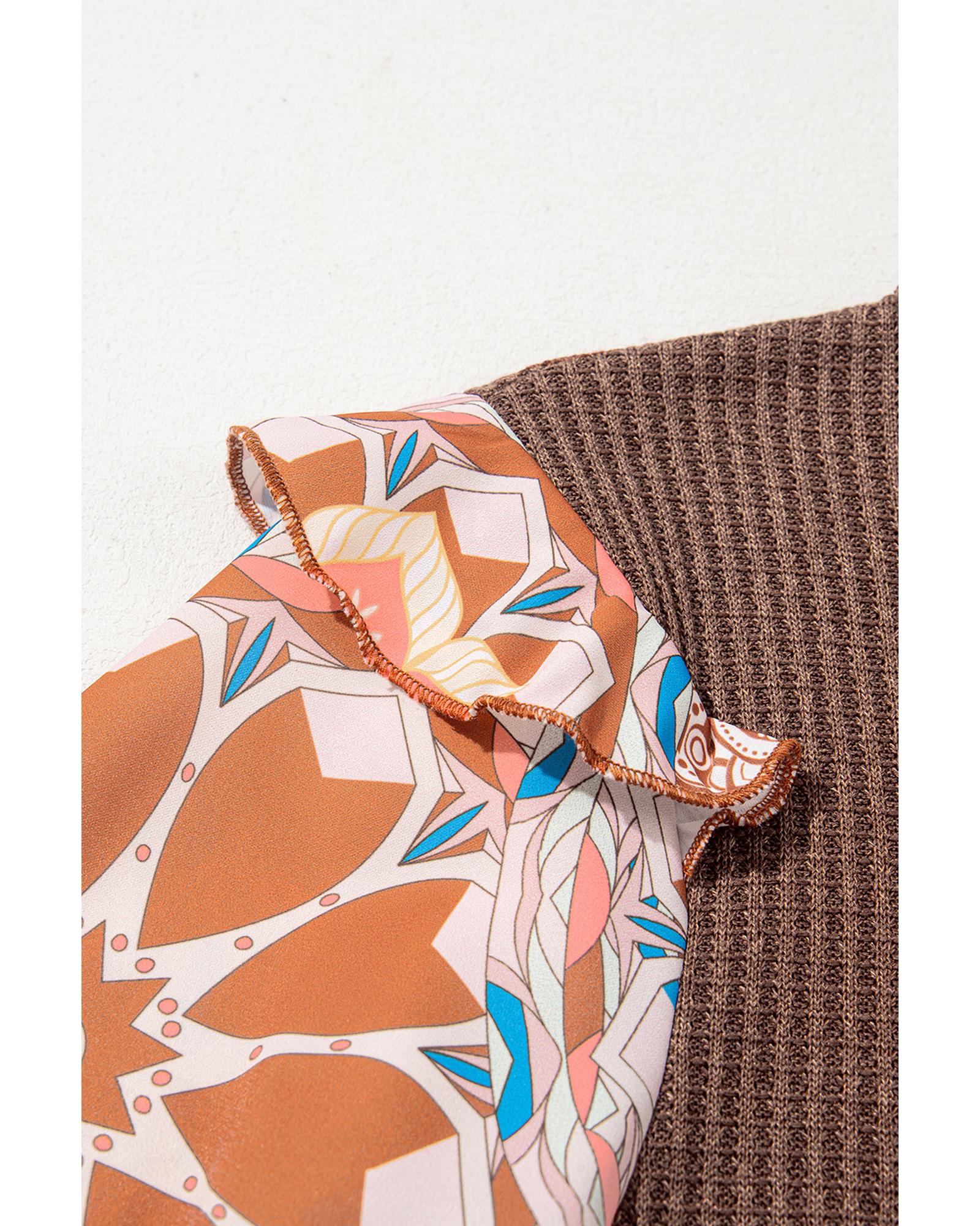 Coffee Ruffled Floral Sleeve Patchwork Waffle Knit O Neck Blouse – M