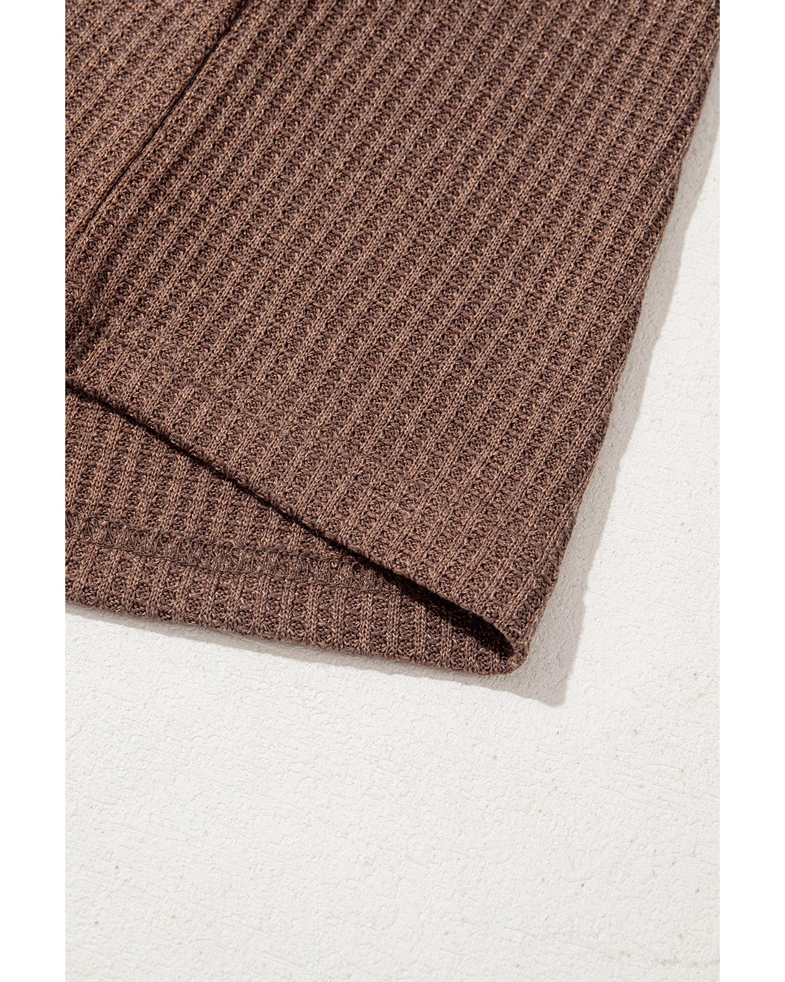 Coffee Ruffled Floral Sleeve Patchwork Waffle Knit O Neck Blouse – XL