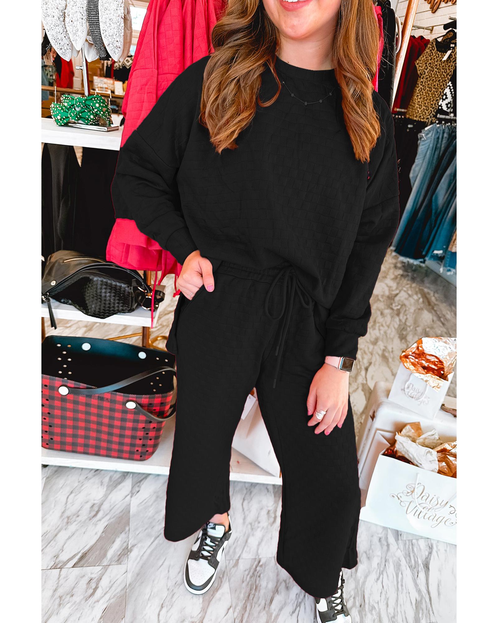 Color black Checkered Textured Split Pullover Top and Pants Set – XL