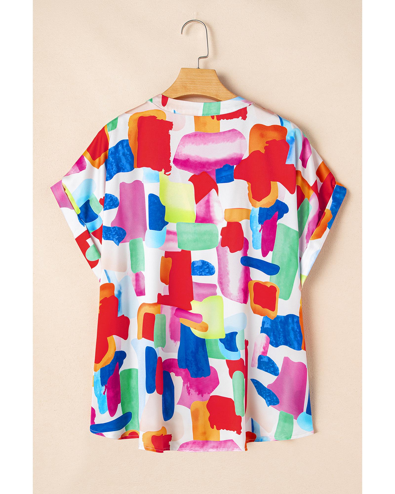 Colorful Brush Stroke Printed Plus Size Button Split Neck Blouse – 1X
