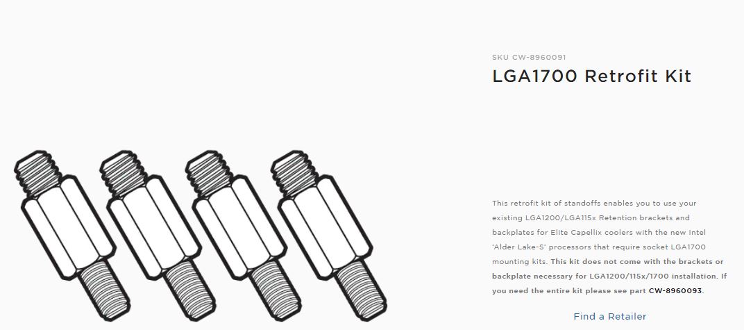 This retrofit kit of standoffs enables you to use your existing LGA1200/LGA115x Retention brackets and backplates for Elite Capellix coolers with the new Intel Alder Lake-S processors that require socket LGA1700 mounting kits. This kit does not come with the brackets or backplate necessary for LGA1200/115x/1700 installation.