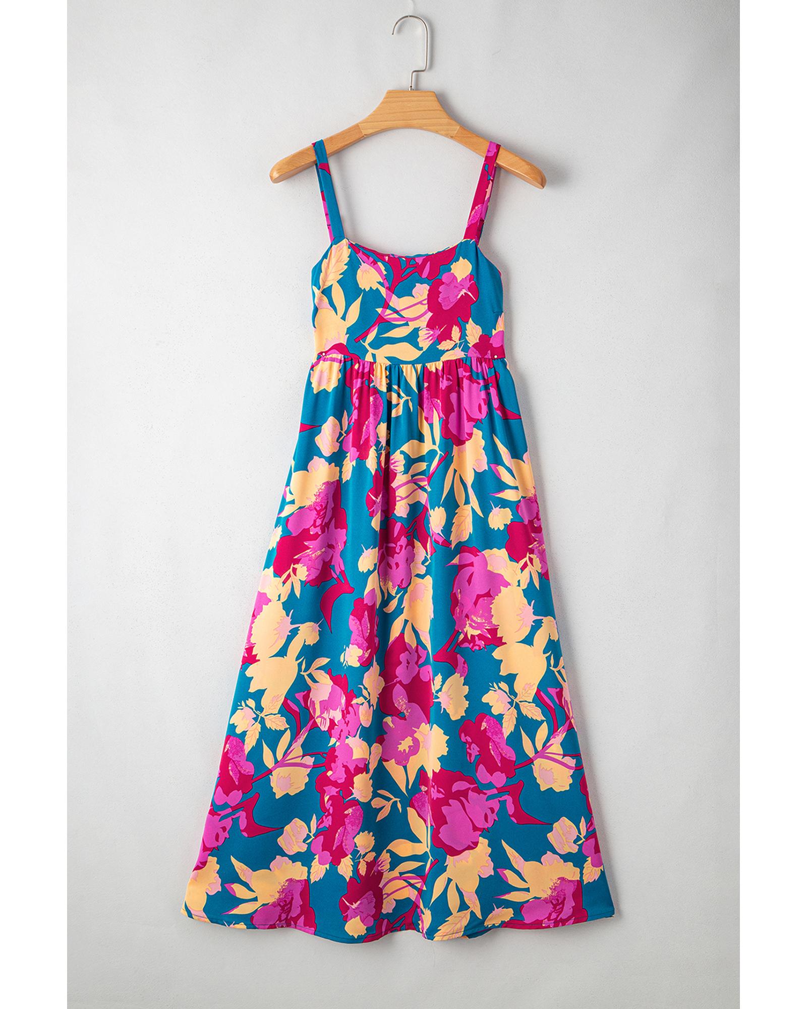 Dark Blue Floral High Waist Sleeveless Flared Long Dress - L